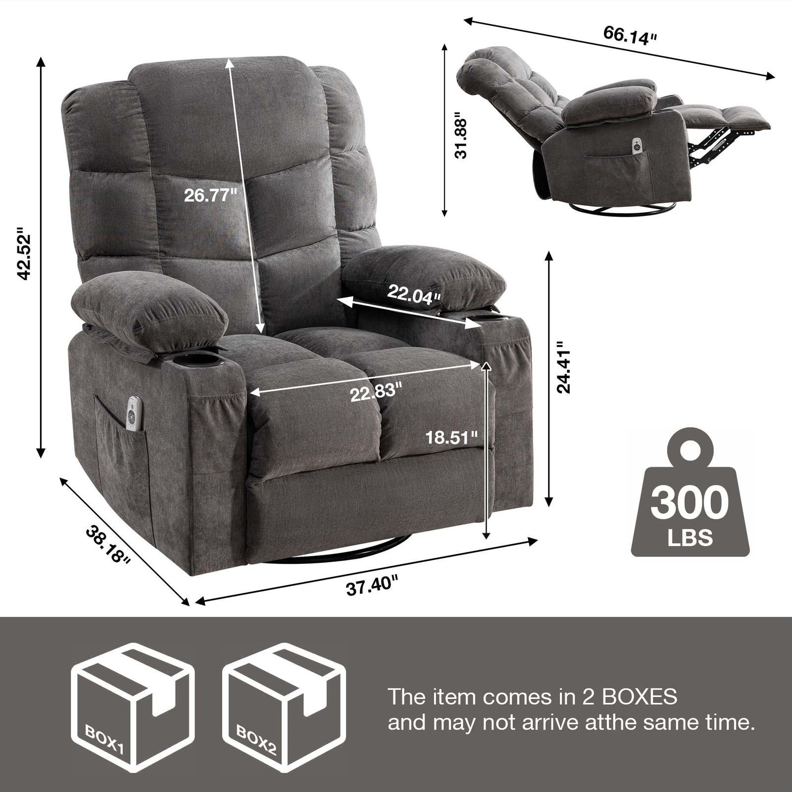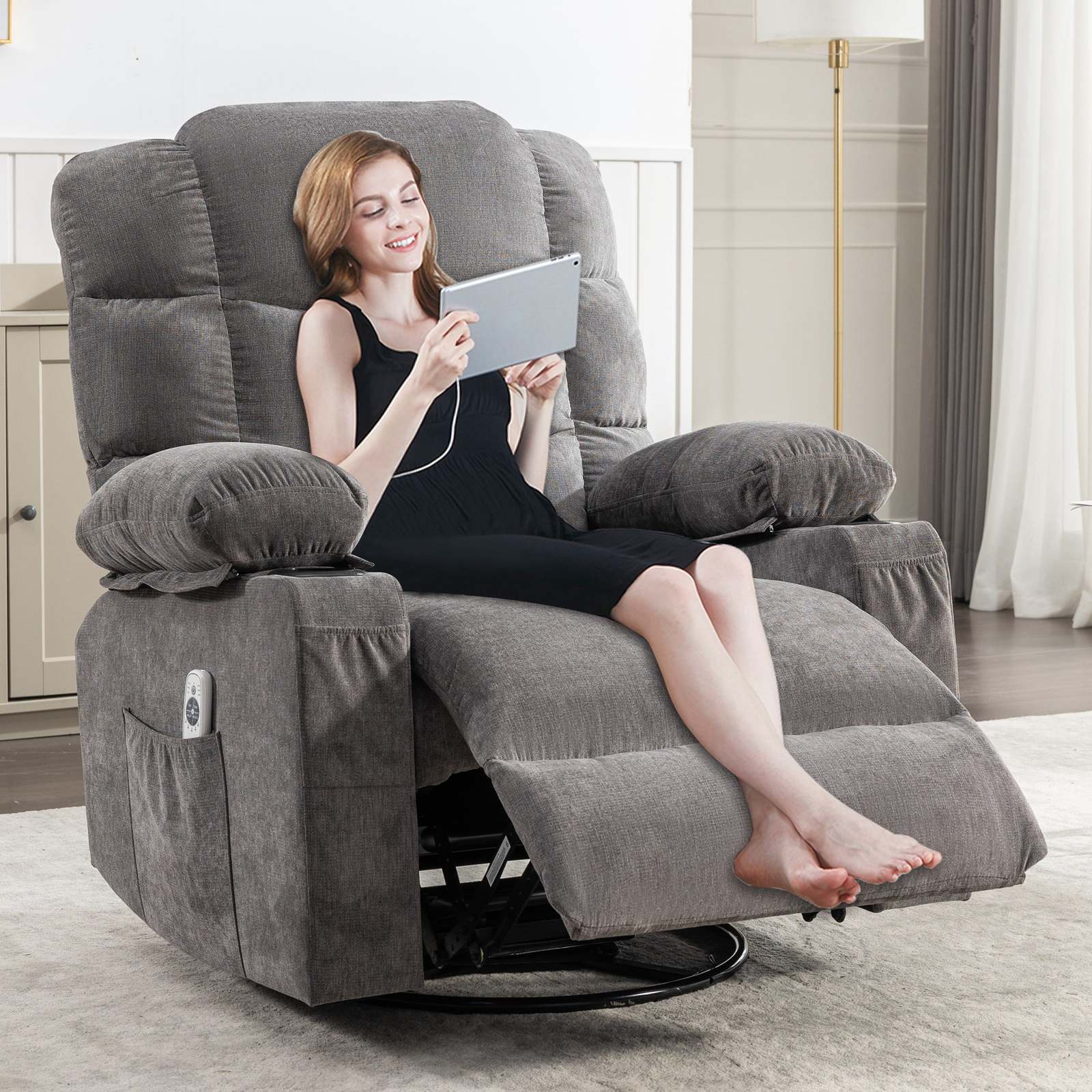 ?CONVENIENT DESIGN?This massage recliner chair has USB charging cable that allow you charging your devices during sitting or reclining, dual side pockets for storing remote control or magazines, and front dual pocket for storing your phone or other small items which are all good design for your daily use (Note: The USB ports ONLY for low-power devices, such as iPhone, iPad.)
