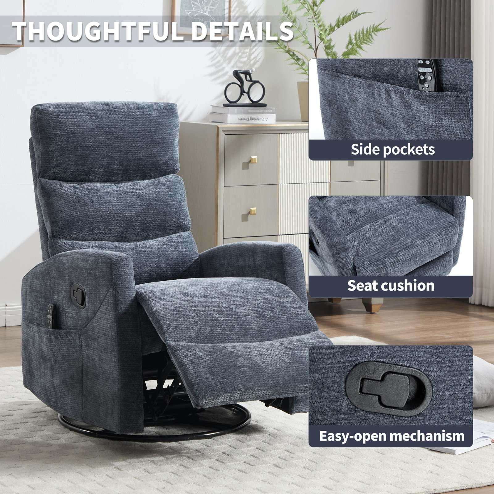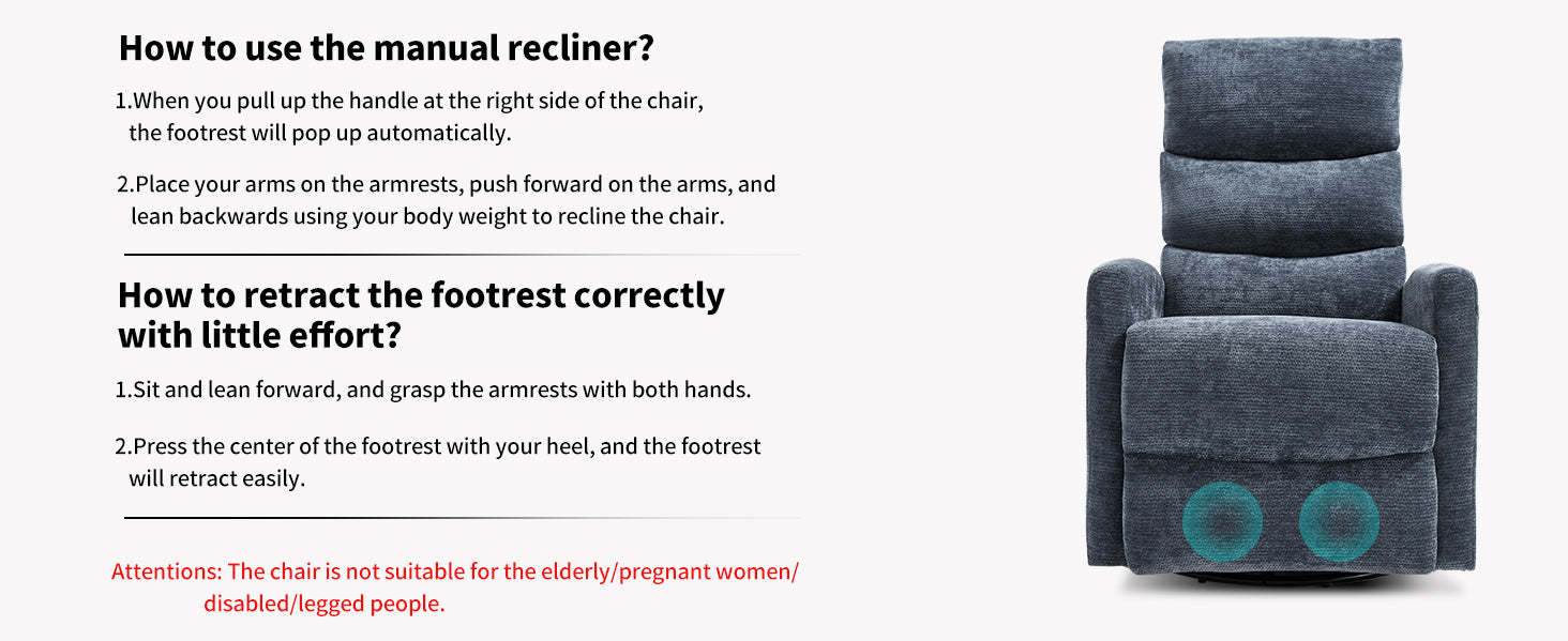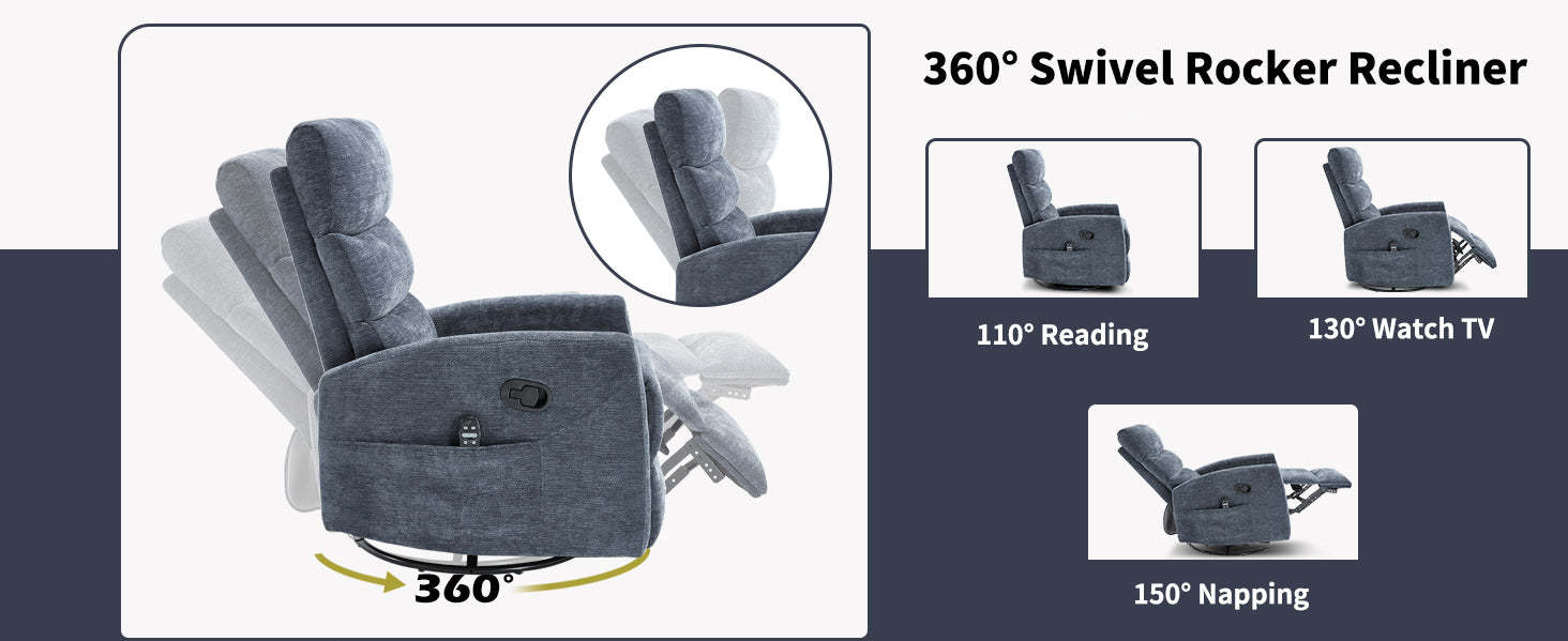 360SWIVEL AND ROCKING RECLINER: The swivel recliner chair has a black metal base that allows for a smooth and gentle 360 degree swivel, and the function of rocking can also make you feel more comfortable and relaxed. You can pull the side button to control the recline of the recliner chair, which means you can get any position you want, it's reclining 15