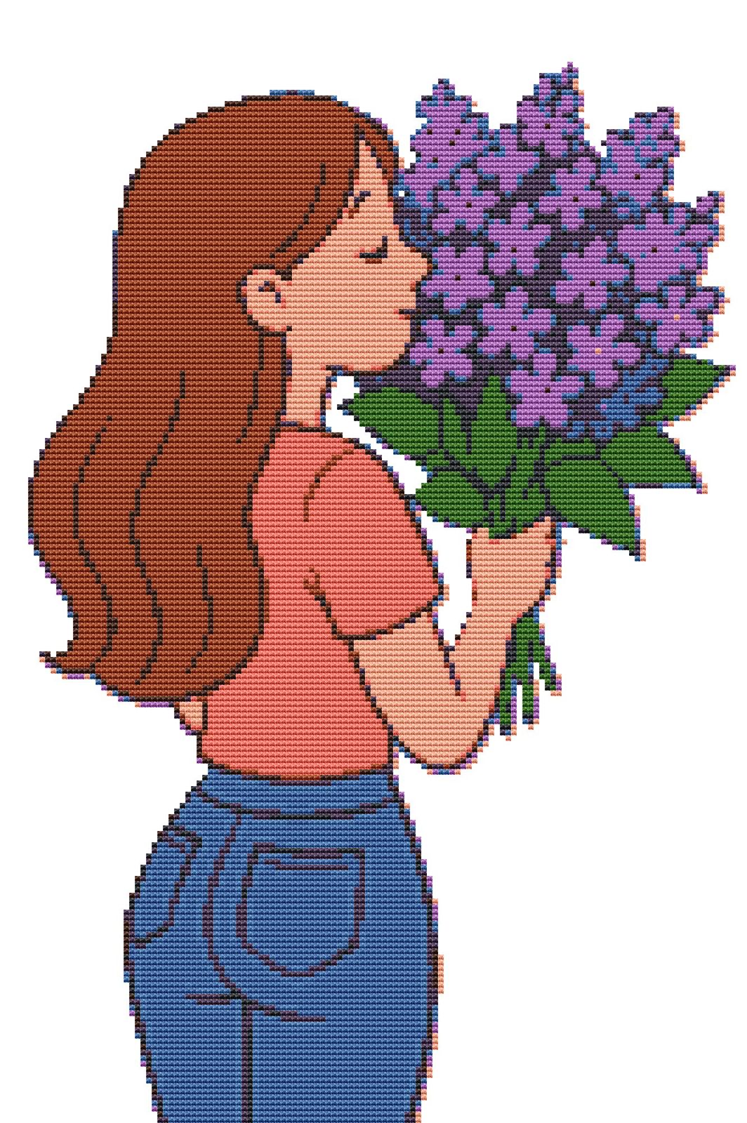 Beautiful girl with perfect figure smells lilac flowers - Cross Stitch Pattern