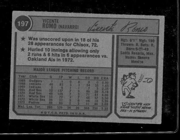 Vintage 1974 Topps Baseball Trading Card Vicente Romo Washington #197. Raw and ungraded. Smoke and pet free.
