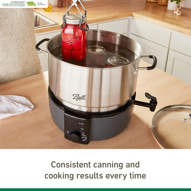 Free up time and space on the stovetop with the Ball EasyCanner. Just fill the freestanding canning pot with water and jars of your favorite canning recipes, set the timer, and relax as it takes care of the rest. The pre-programmed Press Forget technology automates preheating and processing steps with heat sensors that maintain optimal temperatures for consistent results every time while eliminating the time-consuming need to watch the pot.* The 21-quart capacity fits up to 8 pint-size or 7 quart-size jars. When finished, use the spigot for mess-free draining into your sink, and add the lid, rack, and steam tray to the dishwasher for easy cleaning; pot is hand-wash only. Comfortable handles make it easy to lift and tuck away when not in use. Plus, canner includes multicooker and steamer functionality that?s perfect for cooking pastas, soups, vegetables, and seafood, making it the essential all-in-one tool for new and experienced canners alike. *Do not leave appliance unattended.