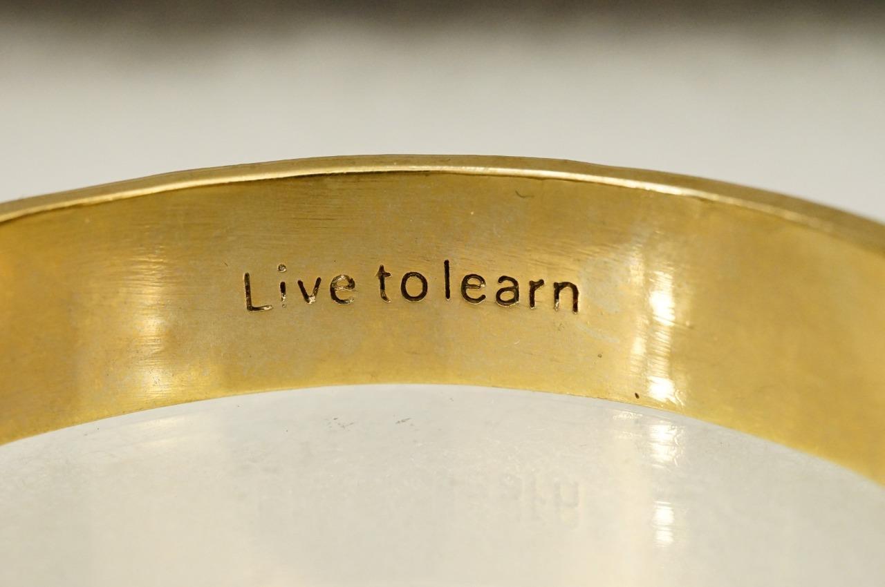 Liz Claiborne Costume Jewelry Bangle Bracelet Green Enamel Live to Learn - gold tone base metal. Signed inside the cuff. Measures 1/2" wide and the inner diameter is 2.5"