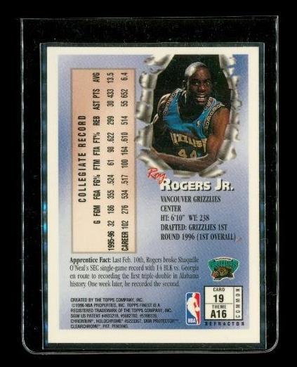 1996-97 Topps Finest #19 Roy Rogers Jr Refractor Rookie Memphis Grizzlies. Peel intact. Raw and ungraded. Smoke and pet free.