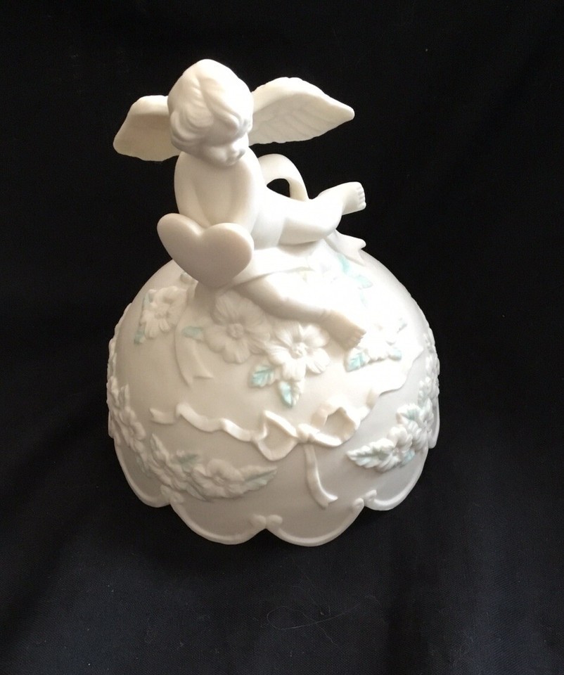 Angel Cherub figurine holding a heart sits on top of white porcelain music box