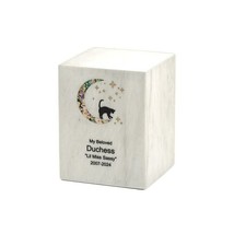 The item you are looking at is our Model Number 012-199507XS. Honor your beloved pet with our artisanal Monumental Memorial Pet Cat Moon urn. Crafted from natural white marble with unique veining, it features a pink shell inlay and vibrant cat and moon details, a meaningful tribute to a cherished companion.