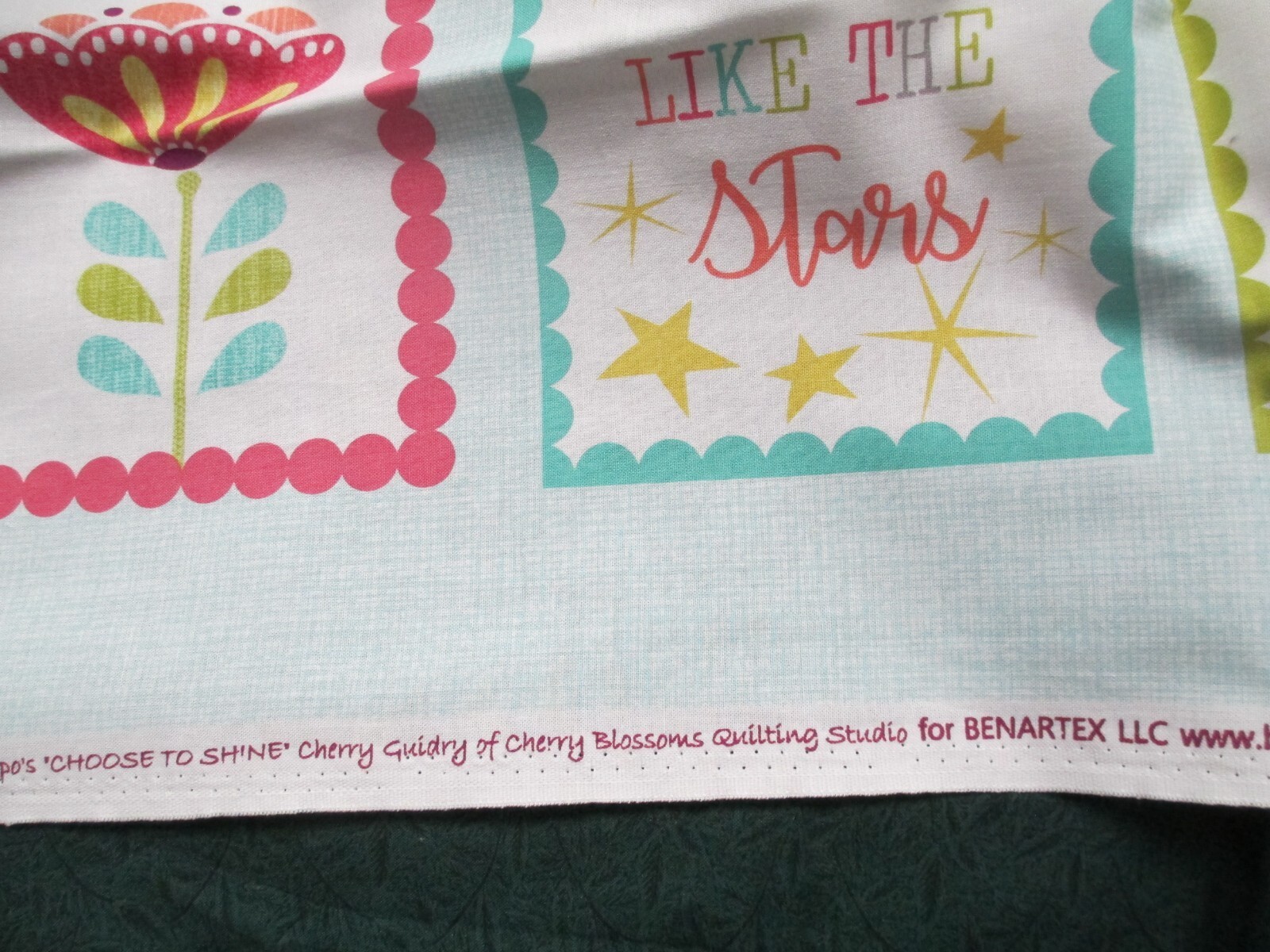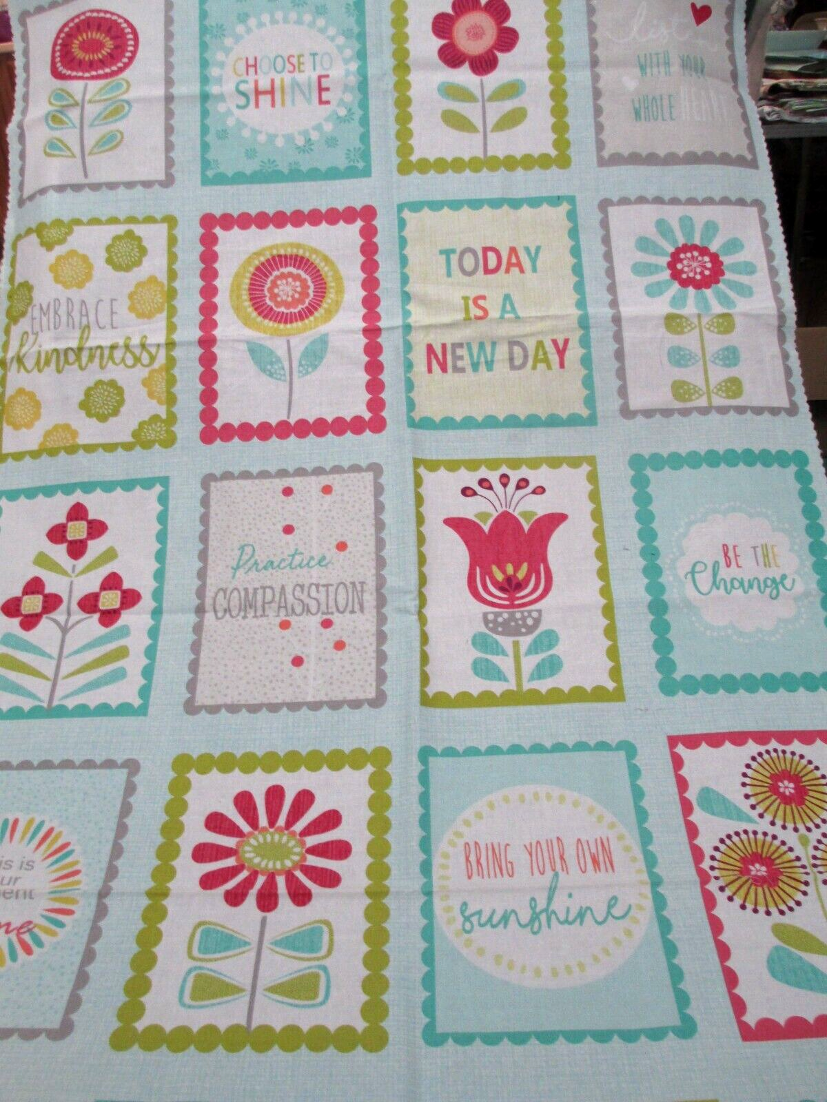 This fabric listing is by Benartex entitled "Choose to Shine" with four 5" square across and five down. Every square has a flower and then a special saying, e.g., Practice compassion, Bring your own sunshine and Be the change. There is enough to sew on a border. The colors are pastels of aqua, yellow and raspberry red. This measures 23" x 44".
