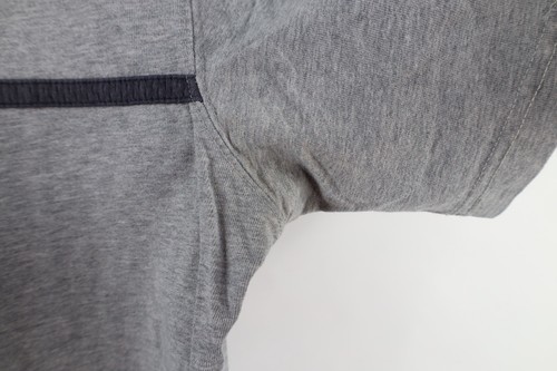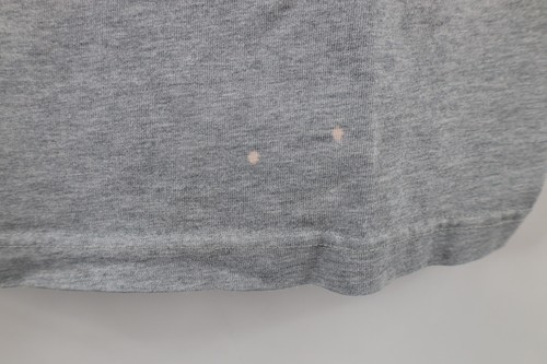 Bleach stains front bottom. Armpits discolored. Holes along collar. Color faded. USA made