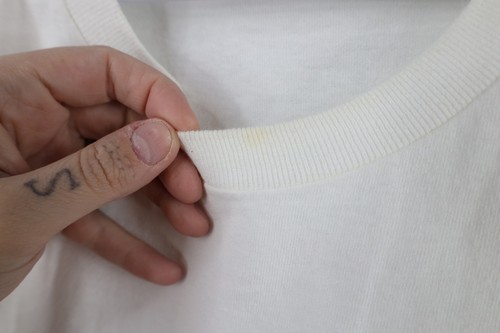 Front middle discolored. Collar blemished/yellowed. Graphics faded