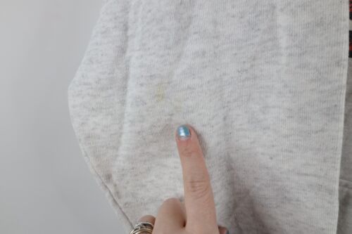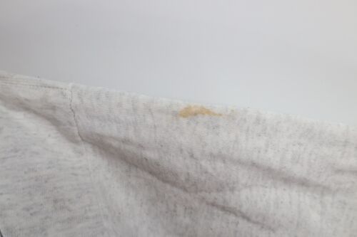 Stains front, back, both arms. Hood yellowed. Color faded. Missing hoodie string. USA made