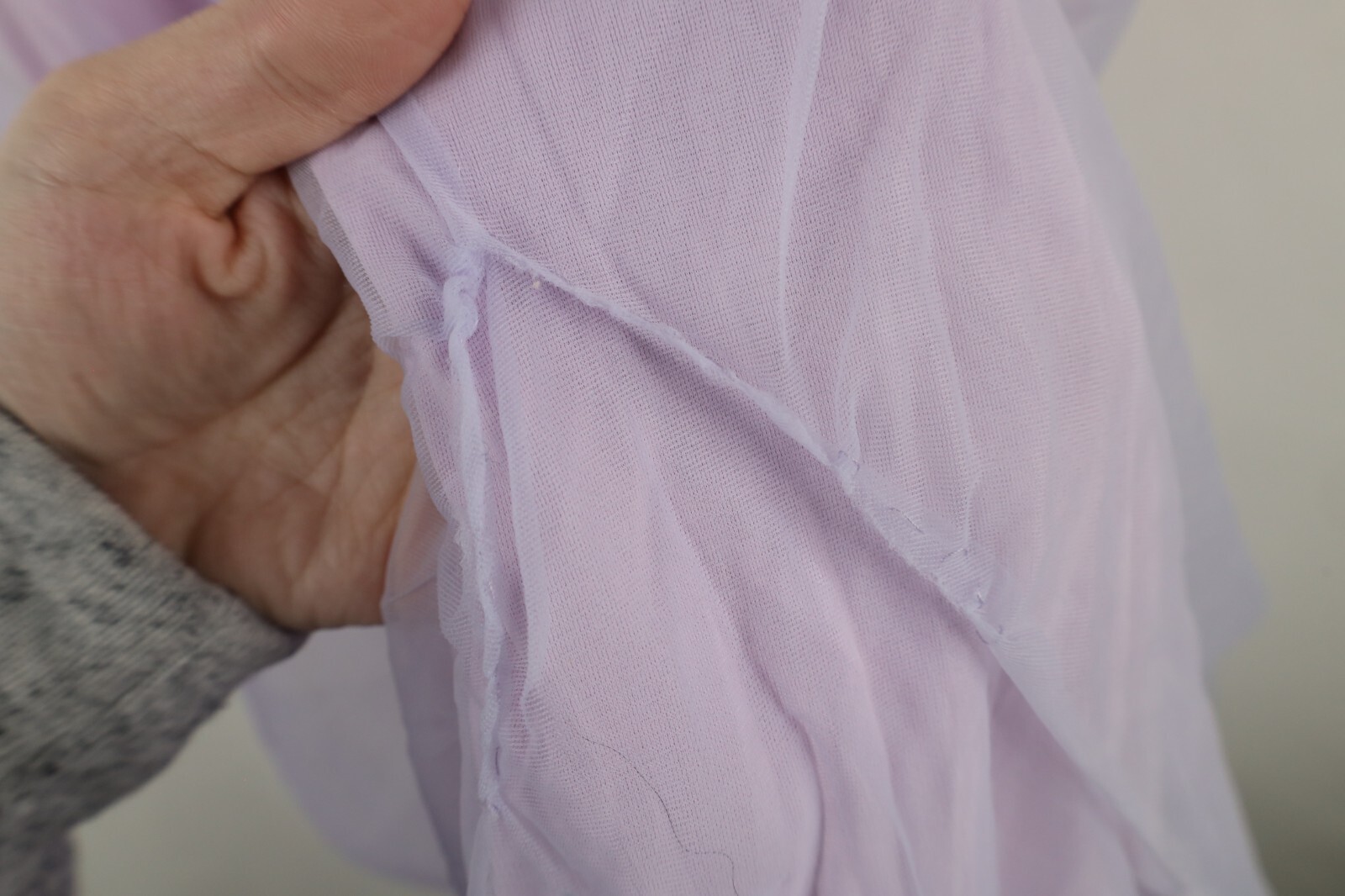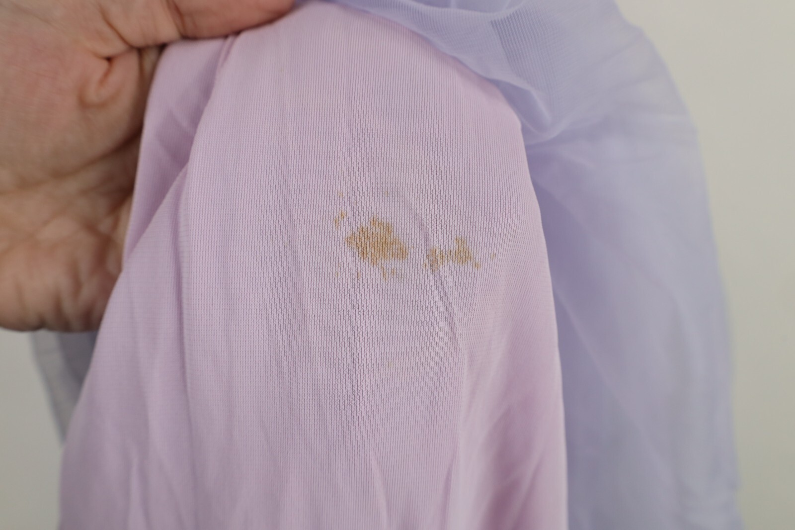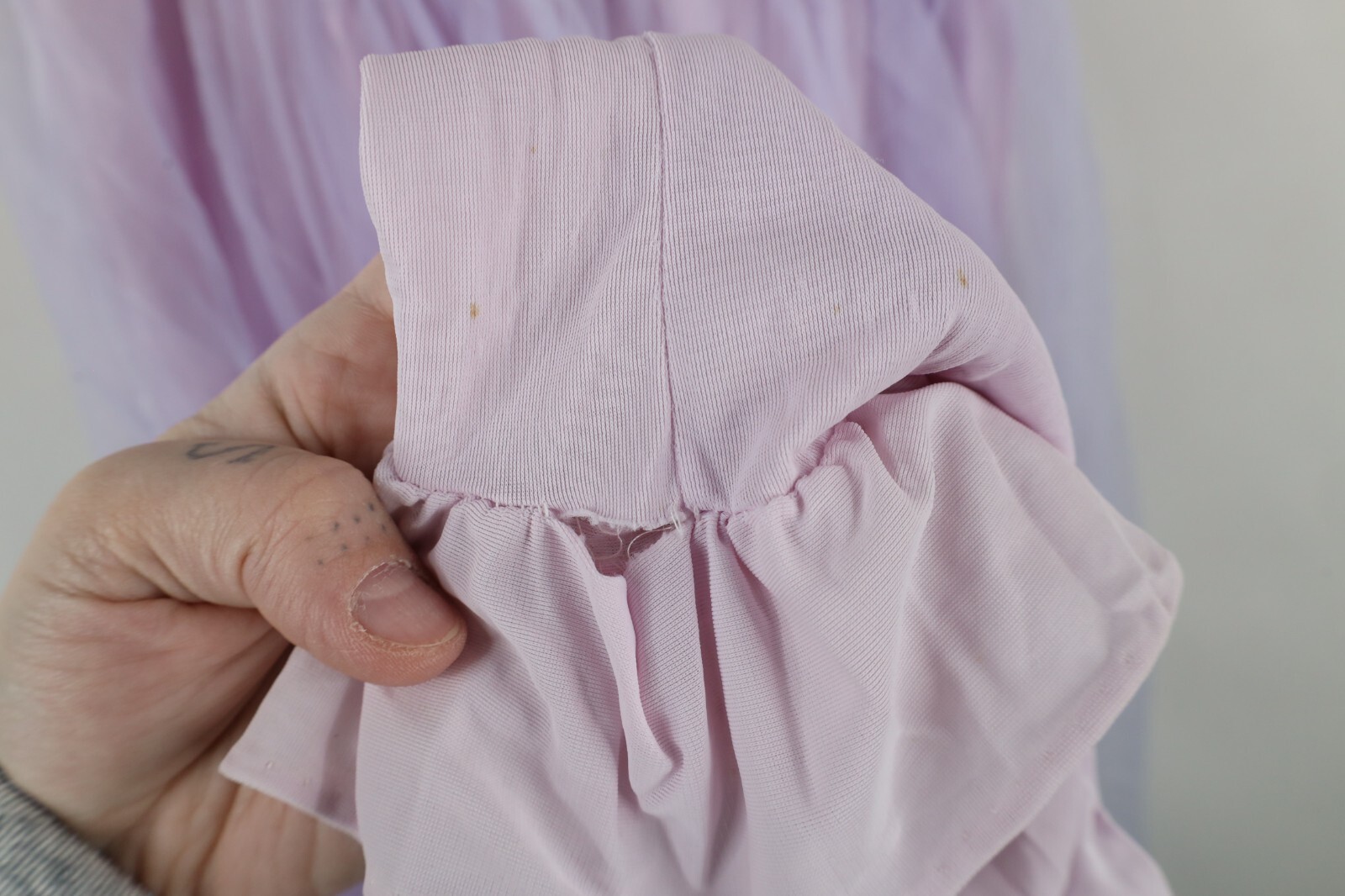 Stains front, back inner layer. Armpits, right arm ripped. Mended hole front. Hole bottom right, collar. Top and inner lining discolored. Made in USA
