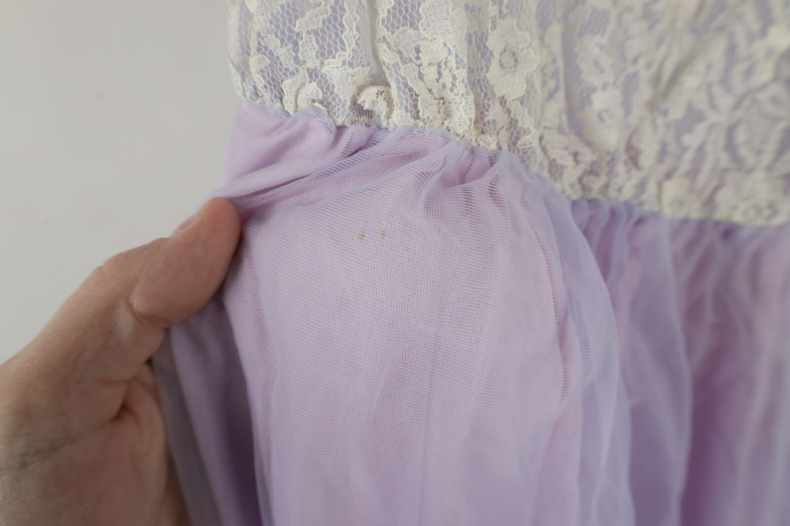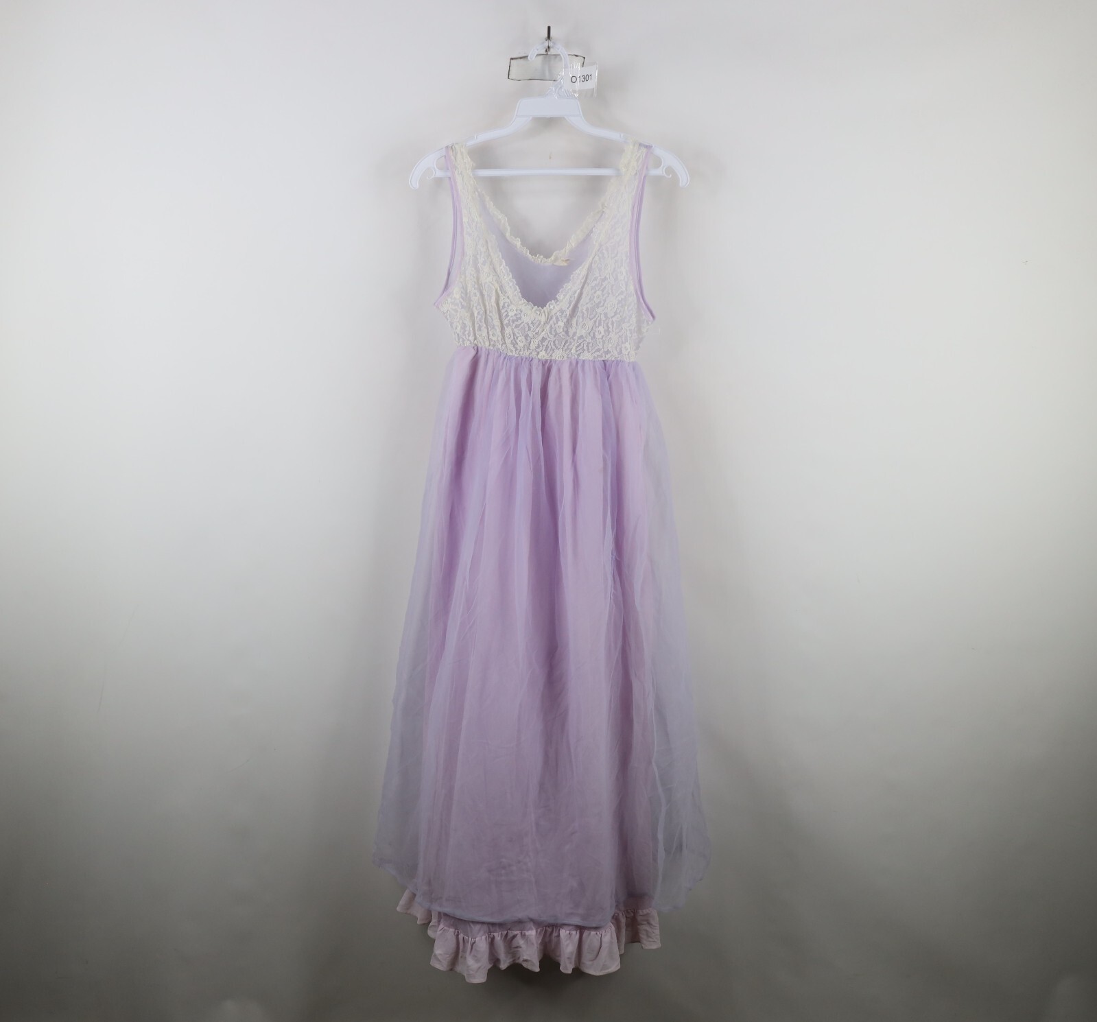 Vtg 60s 70s Womens Medium Baby Doll Chiffon Lace Flower Night Gown Purple USA
