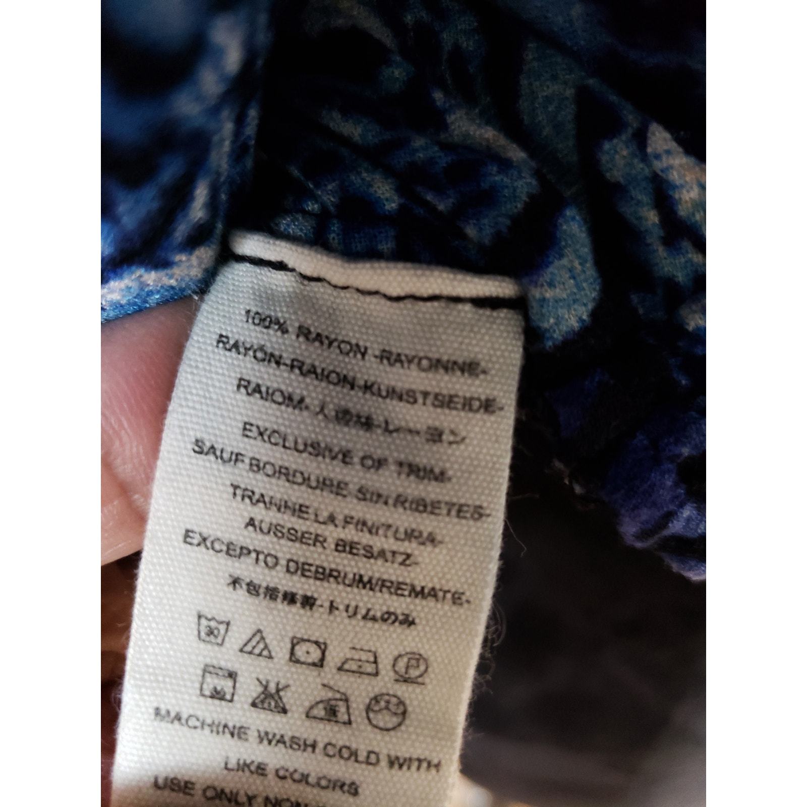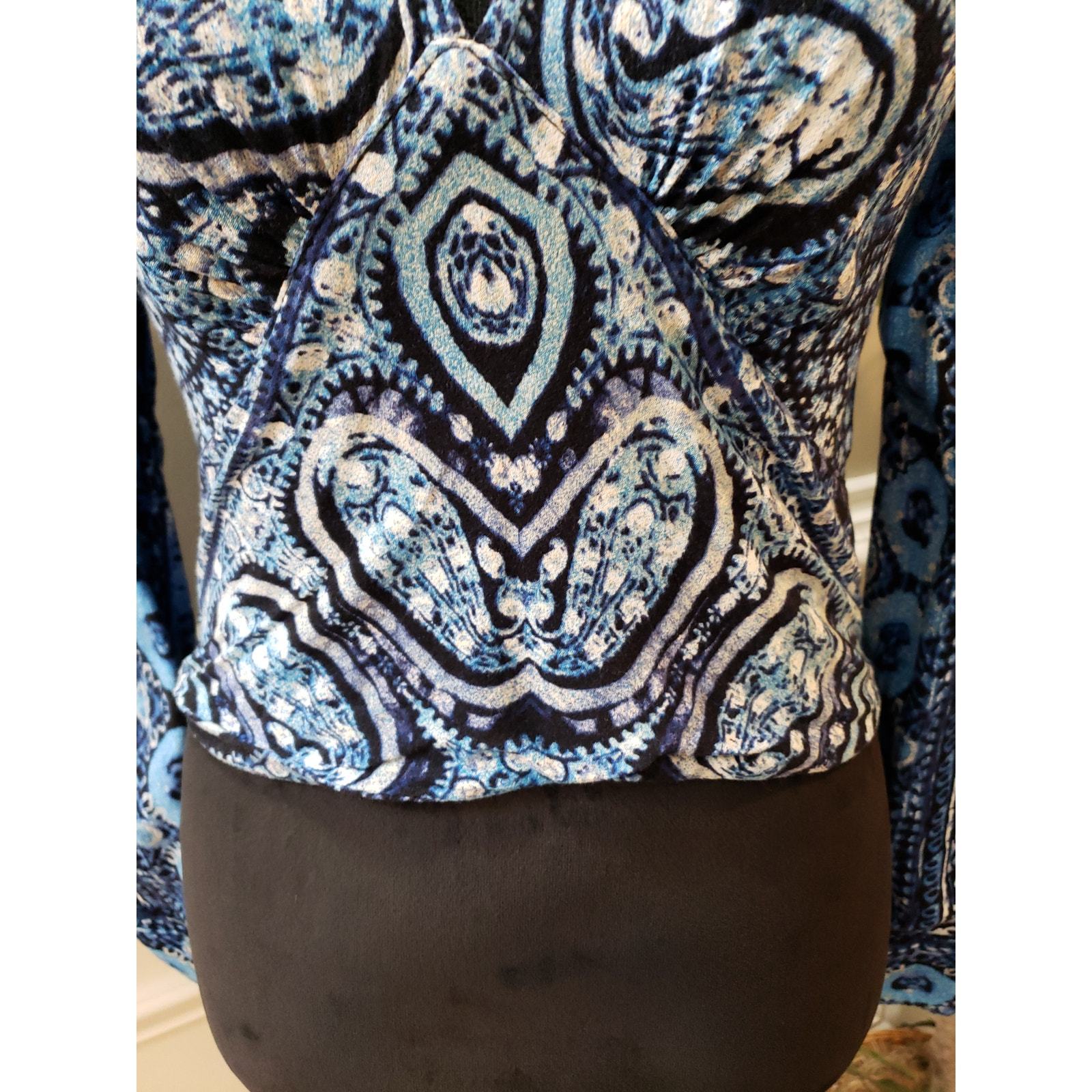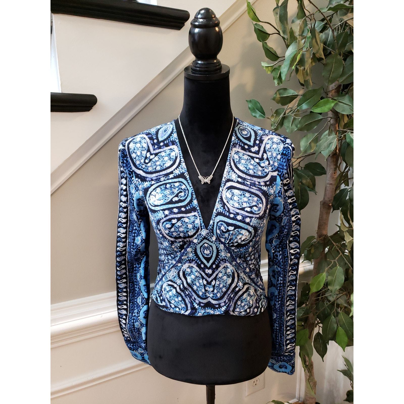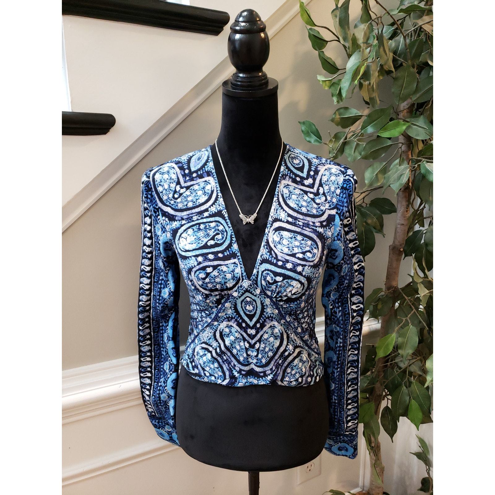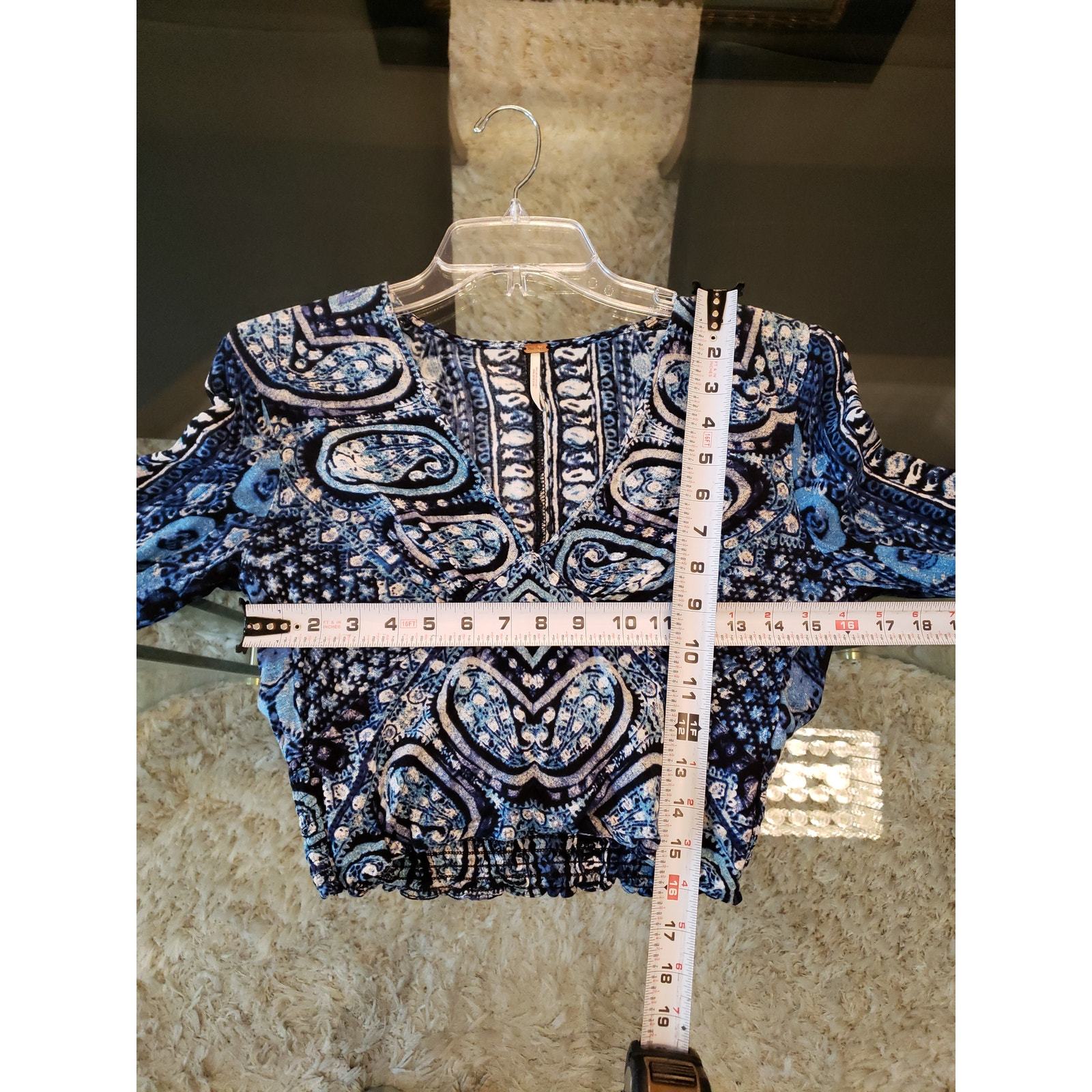 This Free People women's blouse in size XS features a vibrant blue paisley print with a deep plunge neckline and long sleeves. Crafted from soft 100% rayon, this boho-style top is perfect for casual or festival wear. The back features light shirring for a flattering fit and the fabric offers beautiful drape and movement.
