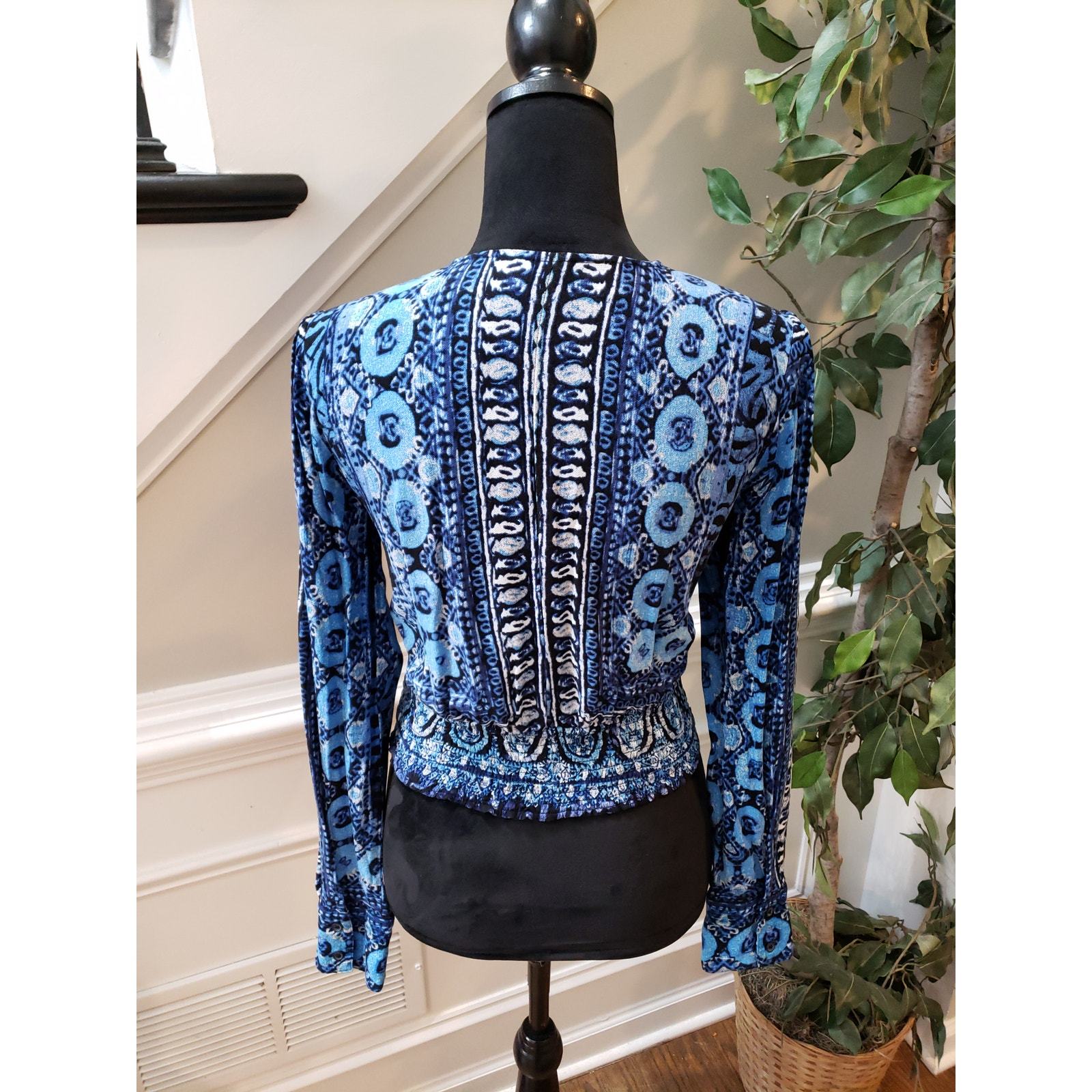 Free People Blouse Women XS Blue Boho Paisley Long Sleeve Plunge Top Rayon