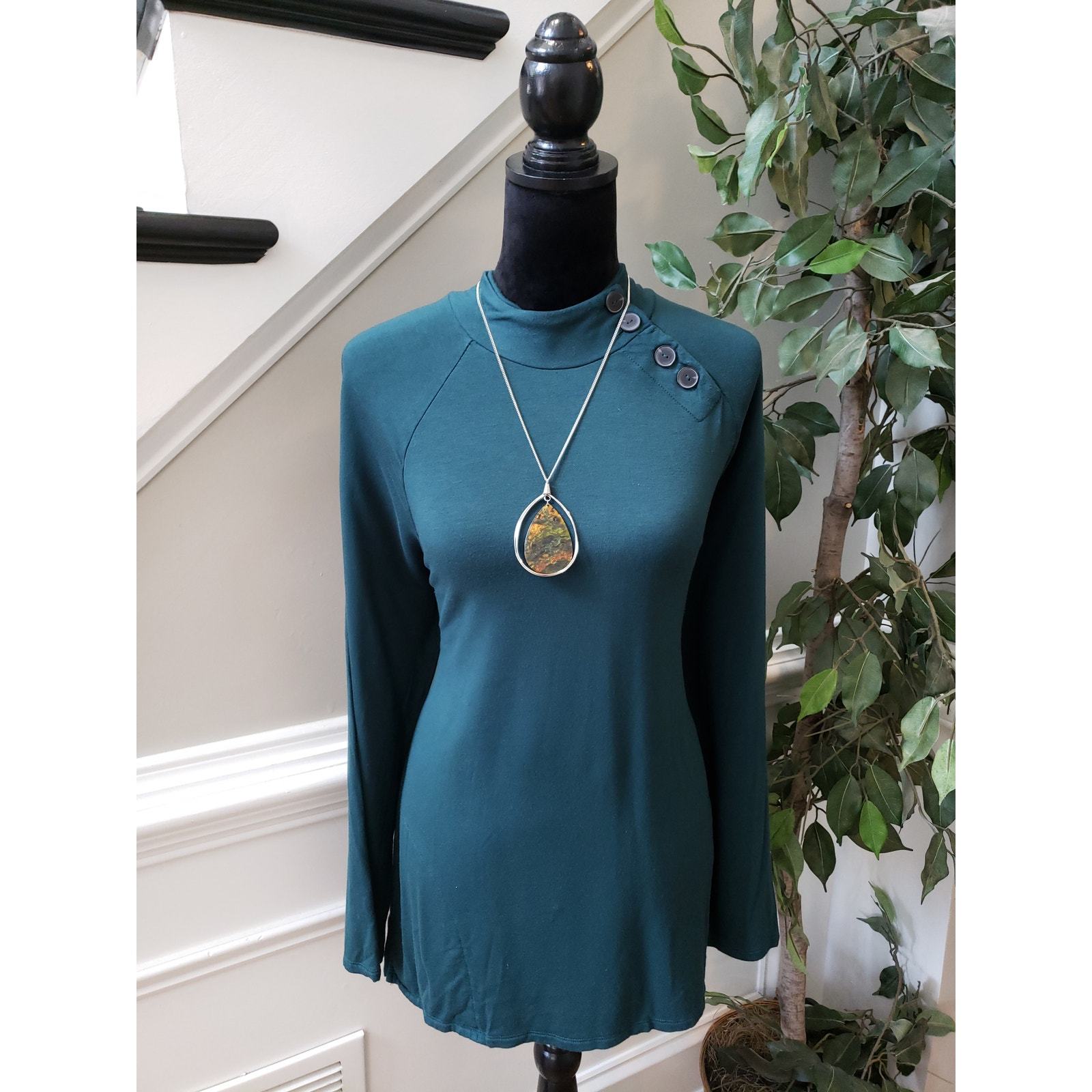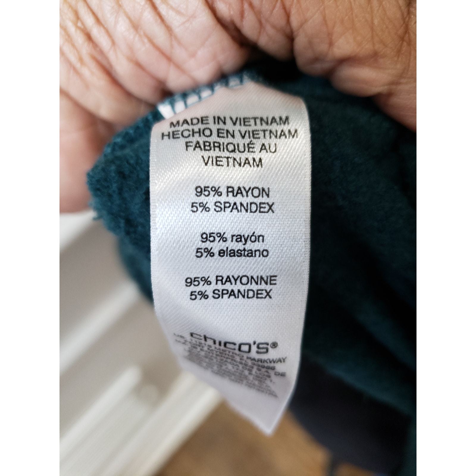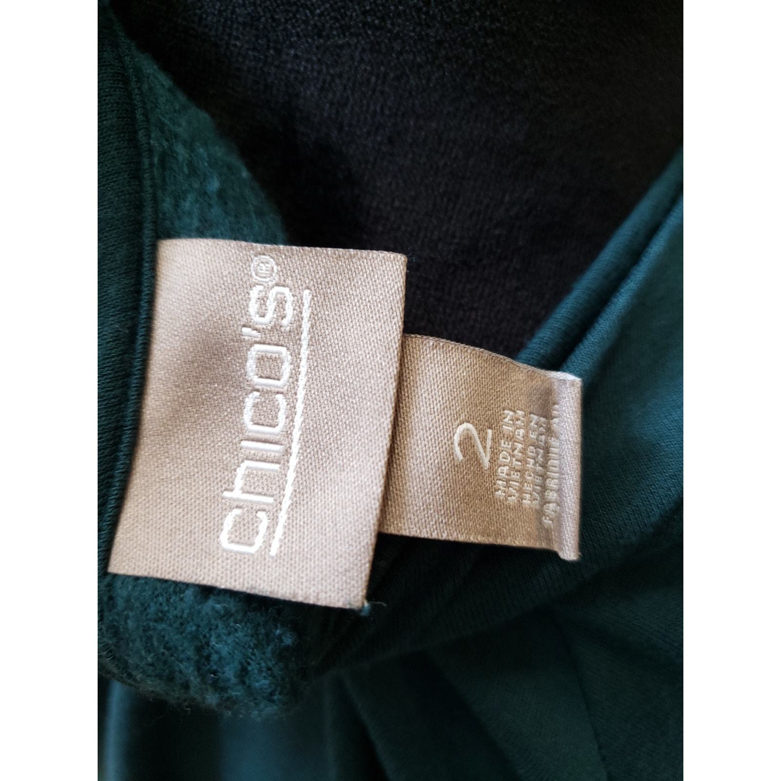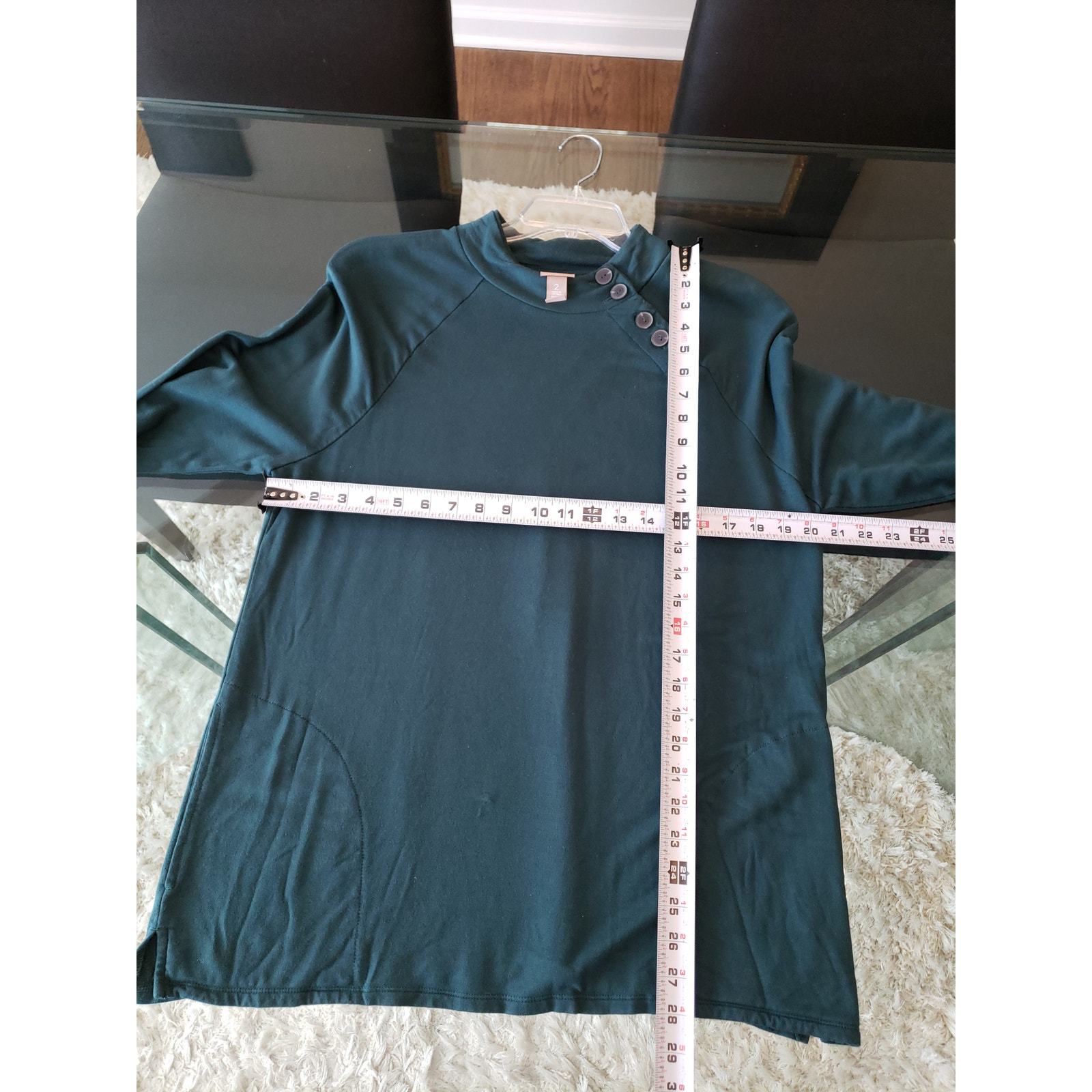 This Chico's long sleeve top features a flattering green color with a stylish button detail on the shoulder. Made from a soft blend of 95% rayon and 5% spandex, it offers a comfortable, stretchy fit perfect for casual or semi-formal wear. The high-quality fabric ensures durability, while the unique design adds a touch of elegance. Size 2/L. Machine washable for easy care.