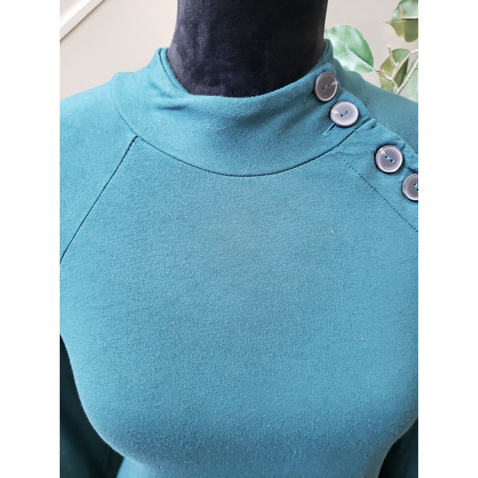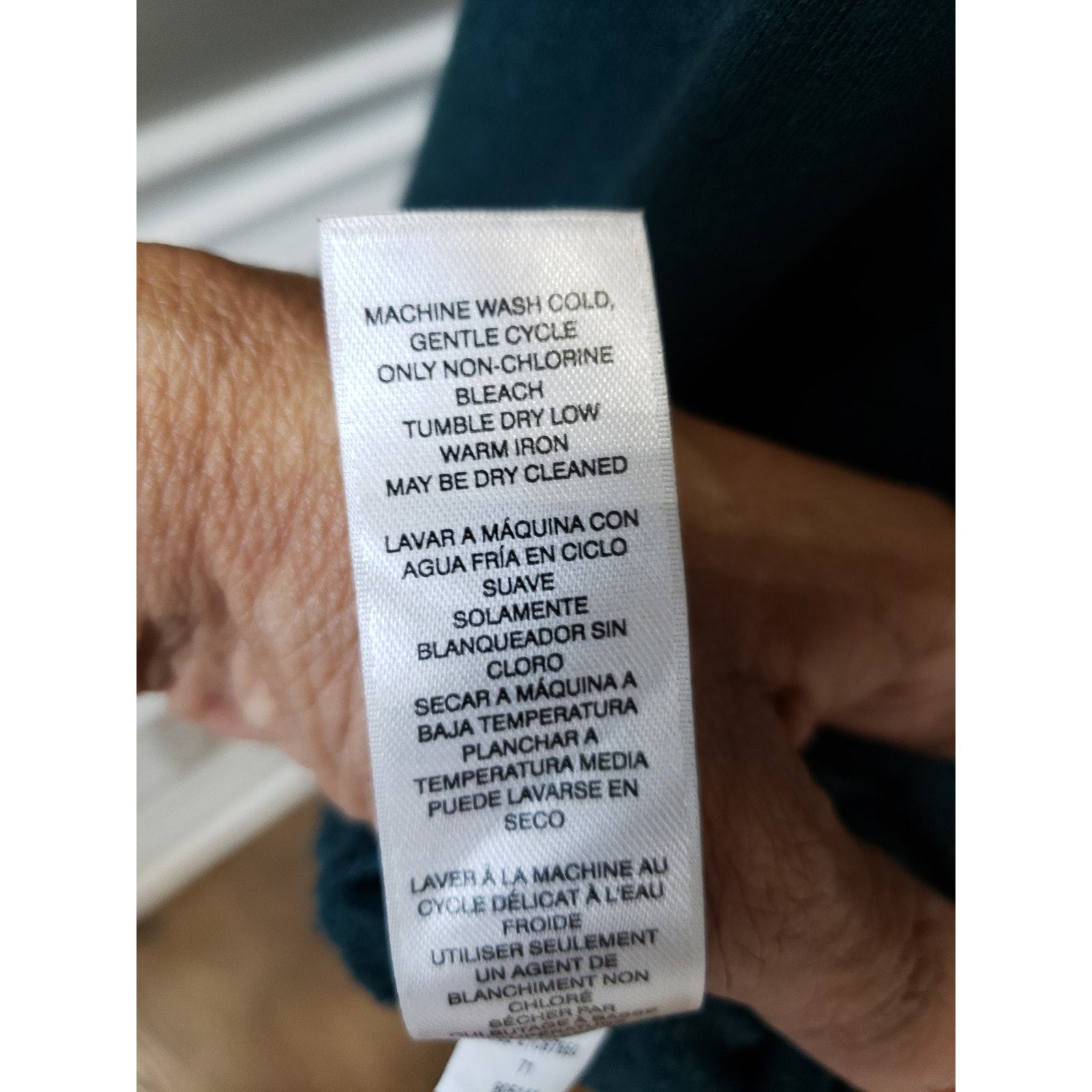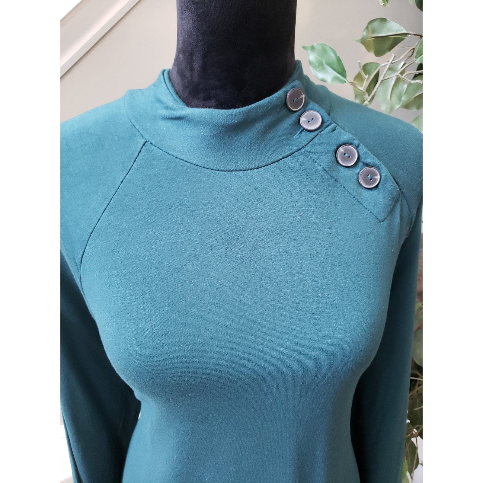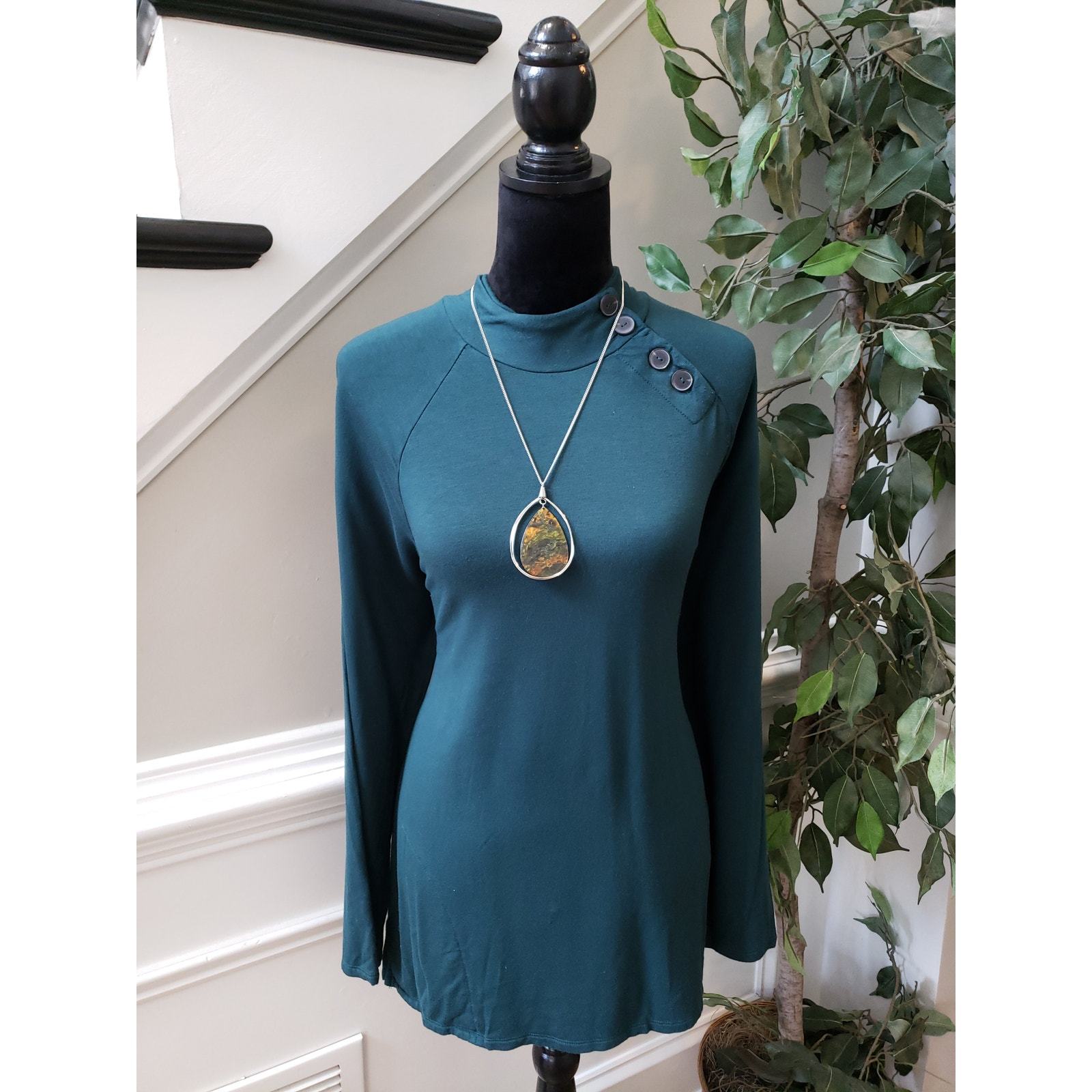 This Chico's long sleeve top features a flattering green color with a stylish button detail on the shoulder. Made from a soft blend of 95% rayon and 5% spandex, it offers a comfortable, stretchy fit perfect for casual or semi-formal wear. The high-quality fabric ensures durability, while the unique design adds a touch of elegance. Size 2/L. Machine washable for easy care.