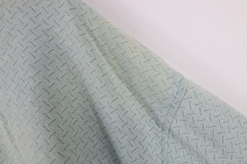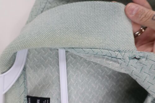 Stains, discoloring front and back. Collar, arms yellowed. Color faded