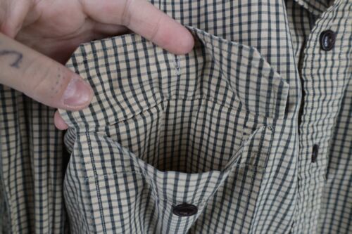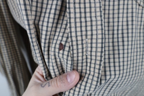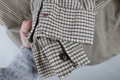 Missing middle button, left cuff button. Thread bare cuffs, collar. Sticker on tag. Color faded