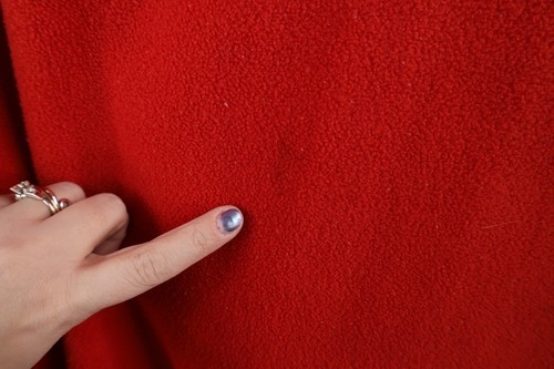 Blemish front top left, middle, left cuff. Color faded. Has pilling