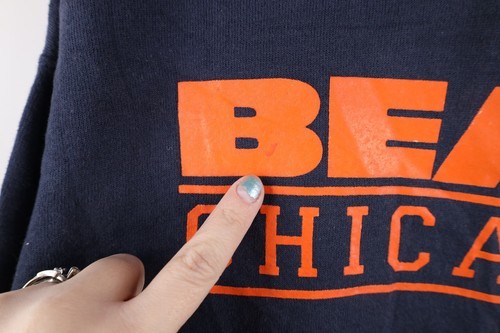 Stains front bottom, inner bottom. Blemish on graphics, graphics faded. Color faded.