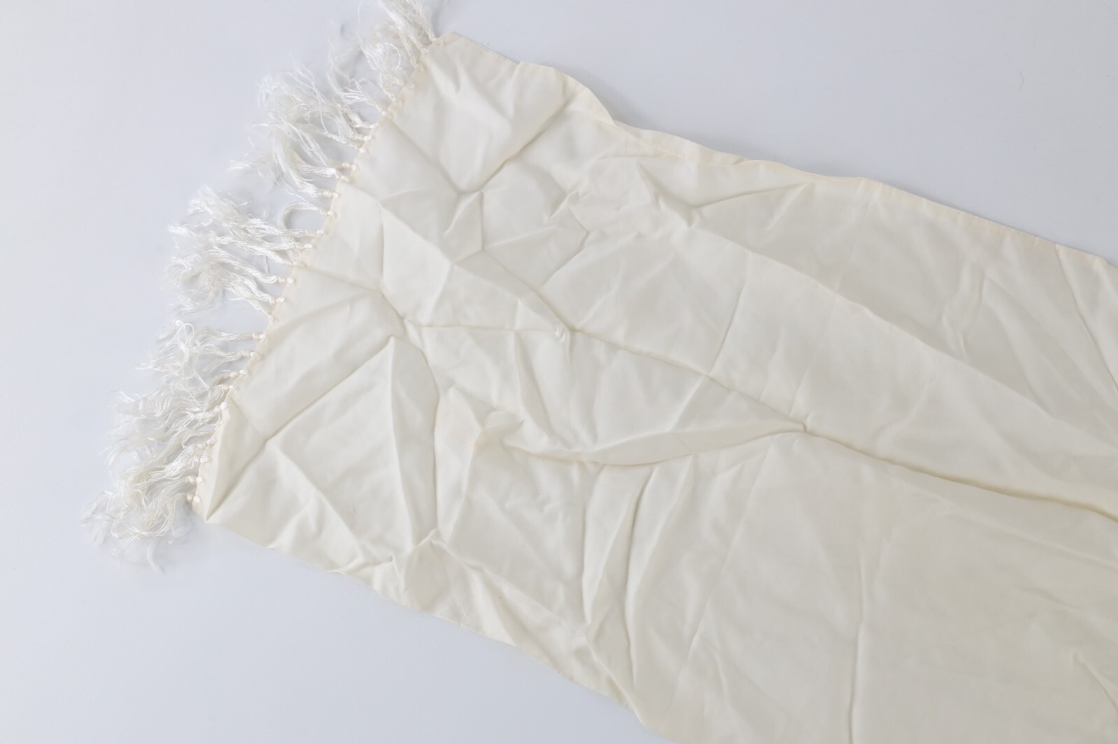 Vintage 40s Rockabilly Rayon Blend M Monogram Fringed Tassel Scarf Wrap White