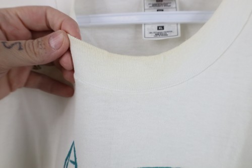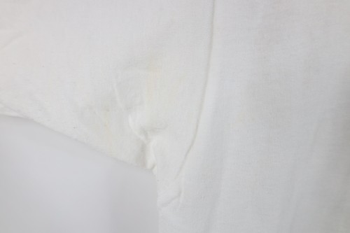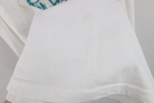 Stains front, back, right arm, collar. Collar, arms discolored. Yellowed. Graphics faded. Pilling. Made in USA