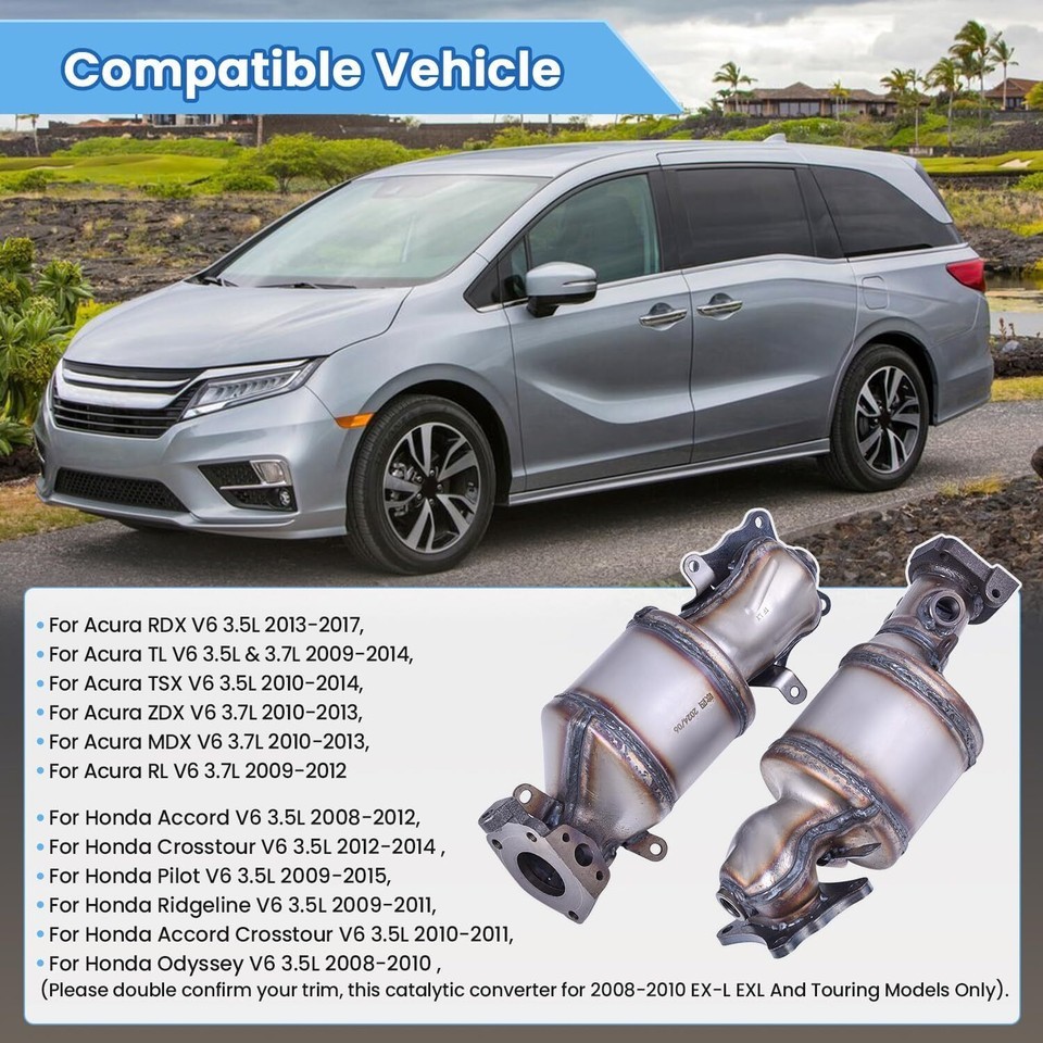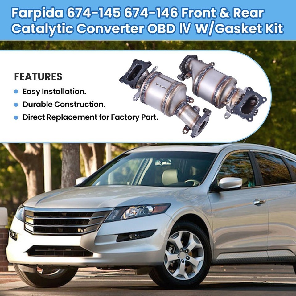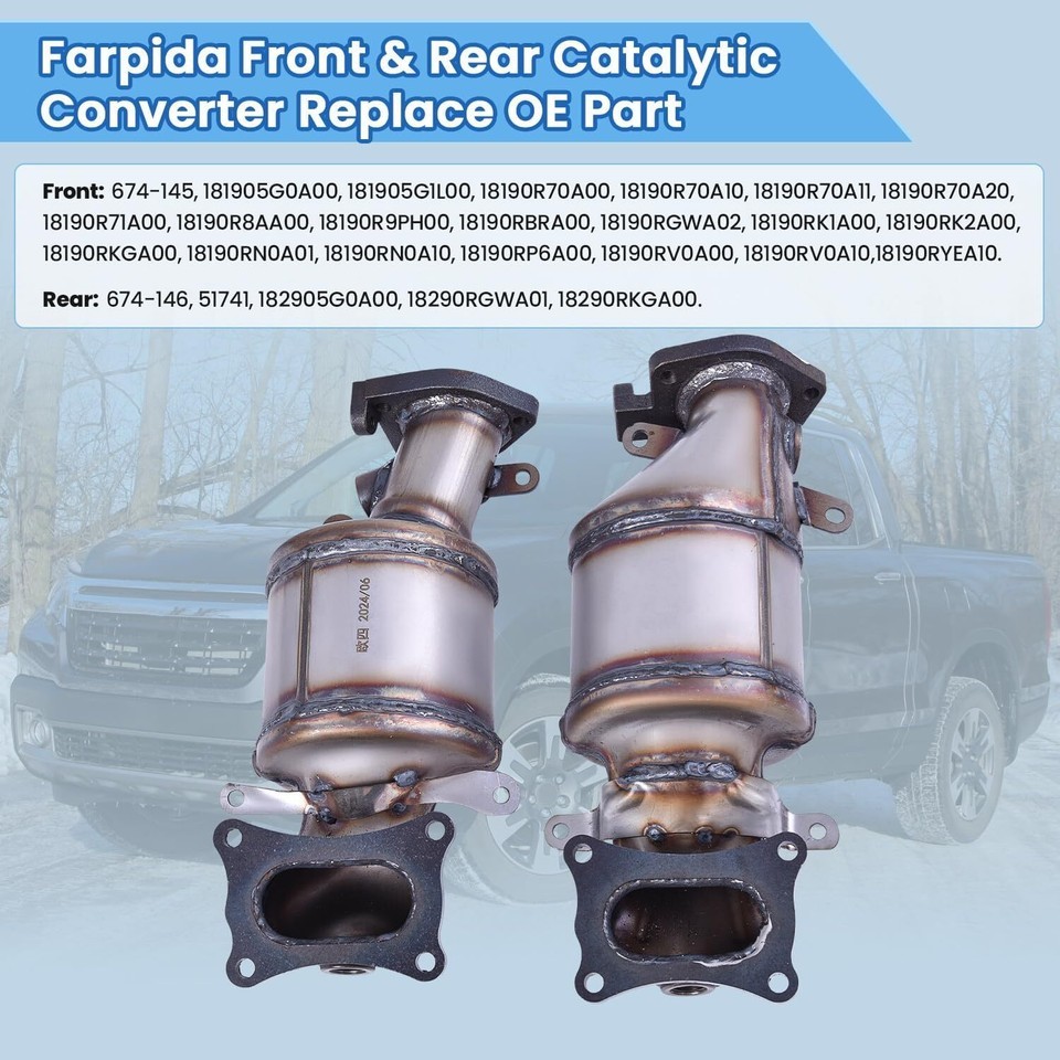 ?Professional Performance?674-145 674-146 Catalytic Converter Set Manufactured with high quality and durable stainless steel three-way catalytic converter housing, heat shield and aluminum-plated steel tube, it is durable and can provide better protection for your vehicle. ?Replace part number? Front Rear Catalytic Converter with Bolts Gasket Replace Front: 674-145, 181905G0A00, 181905G1L00, 18190R70A00, 18190R70A10, 18190R70A11, 18190R70A20, 18190R71A00, 18190R8AA00, 18190R9PH00, 18190RBRA00, 18190RGWA02, 18190RK1A00, 18190RK2A00, 18190RKGA00, 18190RN0A01, 18190RN0A10, 18190RP6A00, 18190RV0A00, 18190RV0A10,18190RYEA10. Rear: 674-146, 51741, 182905G0A00, 18290RGWA01, 18290RKGA00, 18290RN0A10. ?Compatible Vehicle 1?674-145 674-146 Front Rear Catalytic Converter with Bolts Gasket fits for Acura MDX 2010-2019, for Acura RDX 2013-2018, for Acura RL 2009-2012, for Acura TL 2009-2014, for Acura TLX 2015-2017,for Acura TSX 2010-2014, for Acura ZDX 2010-2013. ?Compatible Vehicle 2?674-145 674-146 Front Rear Catalytic Converter with Bolts Gasket fits for Honda Accord Crosstour 2010-2011, for Honda Accord 2008-2017, for Honda Crosstour 2012-2015, for Honda Odyssey 2008-2019, for Honda Pilot 2009-2019, for Honda Ridgeline 2009-2019 3.5L. ?Services?At Farpida, we provide 7/24 response service, if you are not satisfied with the product, you can return it within 30 days, if you have any questions, please contact-us!