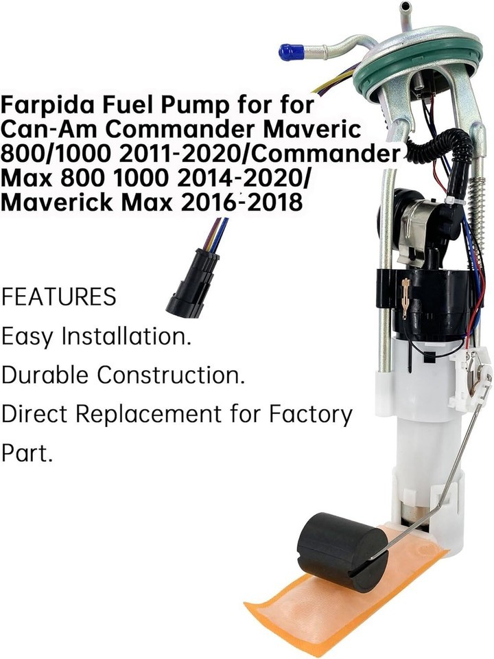 ?High Quality?709000362 709000759 Fuel pump components are manufactured and tested to the same exacting quality standards as our OE fuel pumps to ensure long, reliable service life. ?Replaces Part Number?Fuel Pump Assembly Replace709000362 709000759 . ?Compatible Vehicle ?709000362 709000759 Fuel pump fit for Commander Maveric 800 2011-2020,for Commander Maveric 1000 2011-2020,for Commander Max 800 2014-2020,for Commander Max 1000 2014-2020,for Commander Maverick Max 2016-2018. ?Features? The fuel pump is to suck fuel from the tank, pressurize it and deliver it to the fuel supply line, and work with the fuel pressure regulator to build up a certain fuel pressure. Maximize the performance of your Commander . ?Quick and easy plug-in installation?709000362 709000759 Fuel pump Direct Replacement of Vehicle-Specific Kits:Replace all wear parts at once with our comprehensive installation kits, including fuel pumps, tank seals, and more. ?Service?Farpida's fuel pump assembly module comes with a 1-year wa-rranty. Please feel fr-ee to contact us if you encounter any problems during purchase and use. We will be the first time to serve you.
