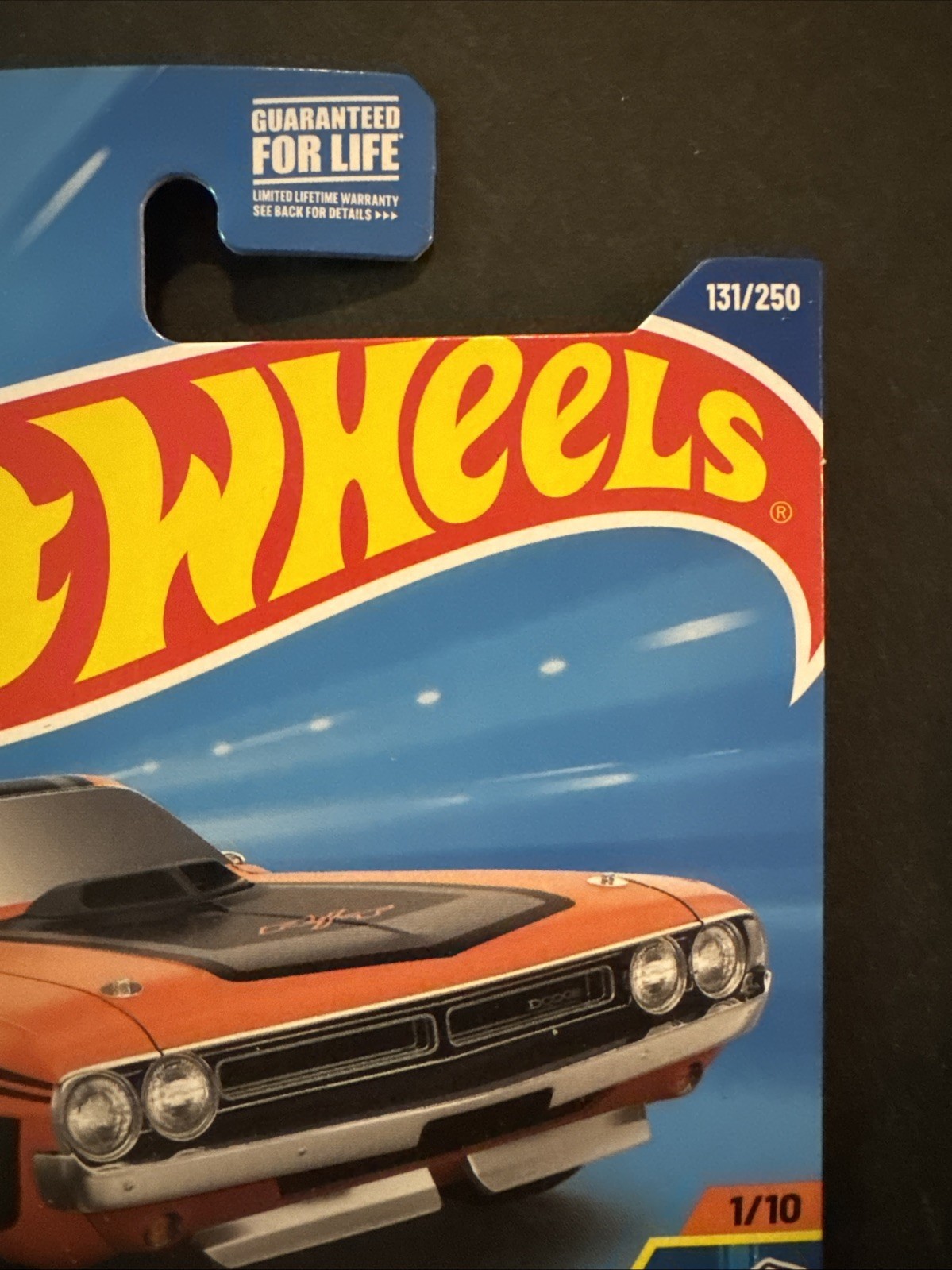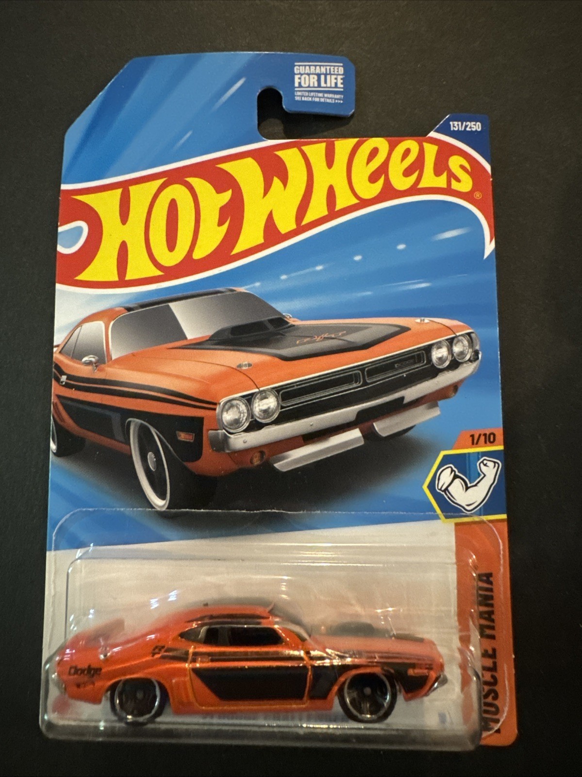 The Hot Wheels Muscle Mania 1/10 ?71 Dodge Challenger 131/250 is a diecast model car in 1:64 scale. This orange-colored Dodge Challenger from 1971 is part of the Hot Wheels Muscle Mania series, specifically designed for boys and girls. The unopened box adds to its collectability, making it a sought-after item for car enthusiasts and collectors. With its detailed design and quality craftsmanship, this Hot Wheels car is sure to be a standout addition to any collection.