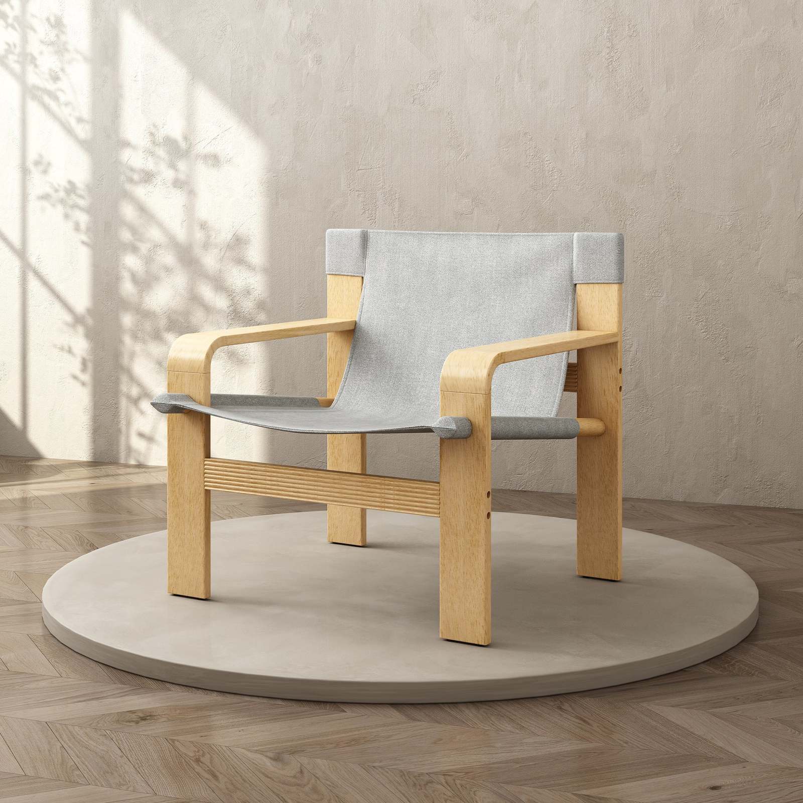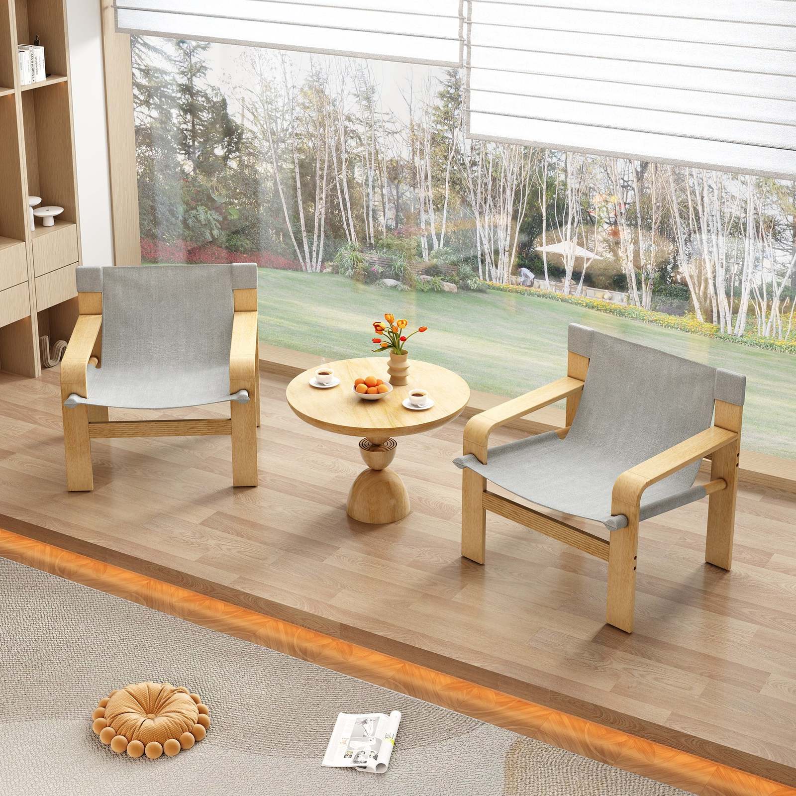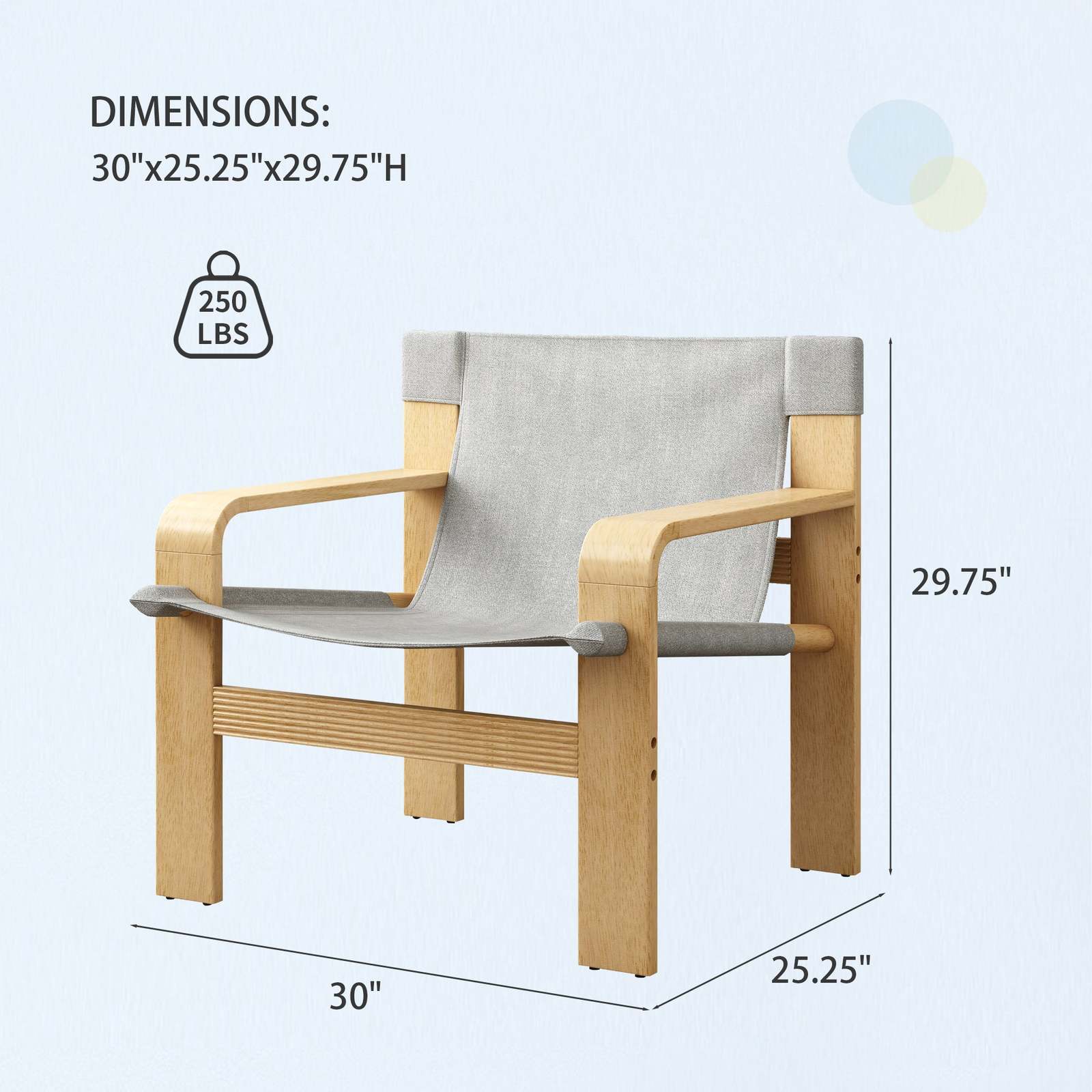 Mid-Century Oak Accent Chair: Washable Linen, Wide Armrest, Light Grey