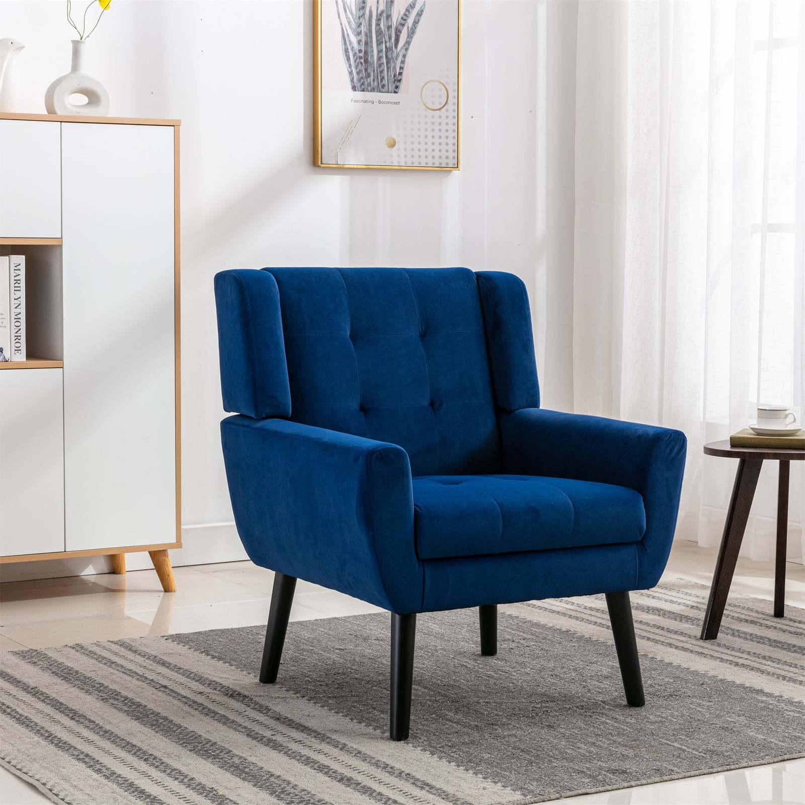 2.The Velvet upholstered accent chair features a padded seat, curved back and neat arm, which can hold you like embracing in the arms, and keep you lounging and relaxing in cushioned comfort.