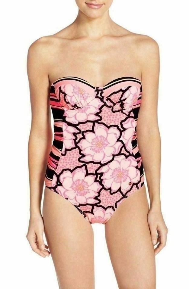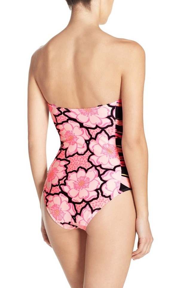Black outlines make this bustier-style swimsuit's hot-pink illustrations pop even more. Darker, ruched side panels work wonders to slim the figure. Perfect for line-less sunbathing, the swimsuit comes with supportive, detachable straps for when you want to switch up the silhouette.