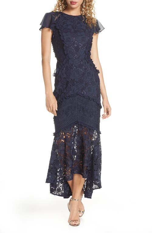 Chi Chi London Crochet Lace Flounce Sleeve Dress Sz 4 Navy