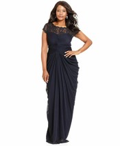 Adrianna Papell Short-Sleeve Illusion Lace Pleat Gown Sz 6 Navy
