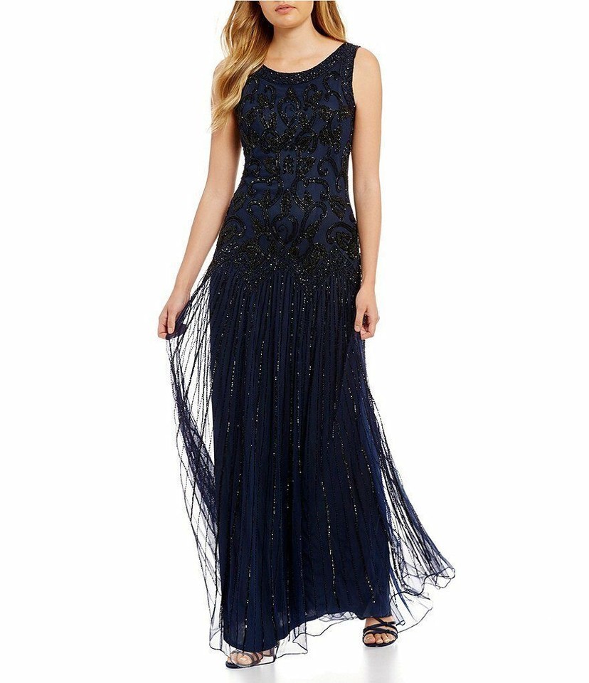 From Pisarro Nights, this gown features: rounded neckline with beaded trim sleeveless rounded neckline with beaded trim sequined bodice detailing beaded drop waistline