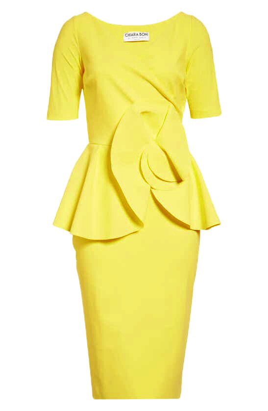 Delightful lemon yellow sets the mood for this posh sheath dress flaunting petal-like panels on the peplum and plenty of stretch for easy movement.