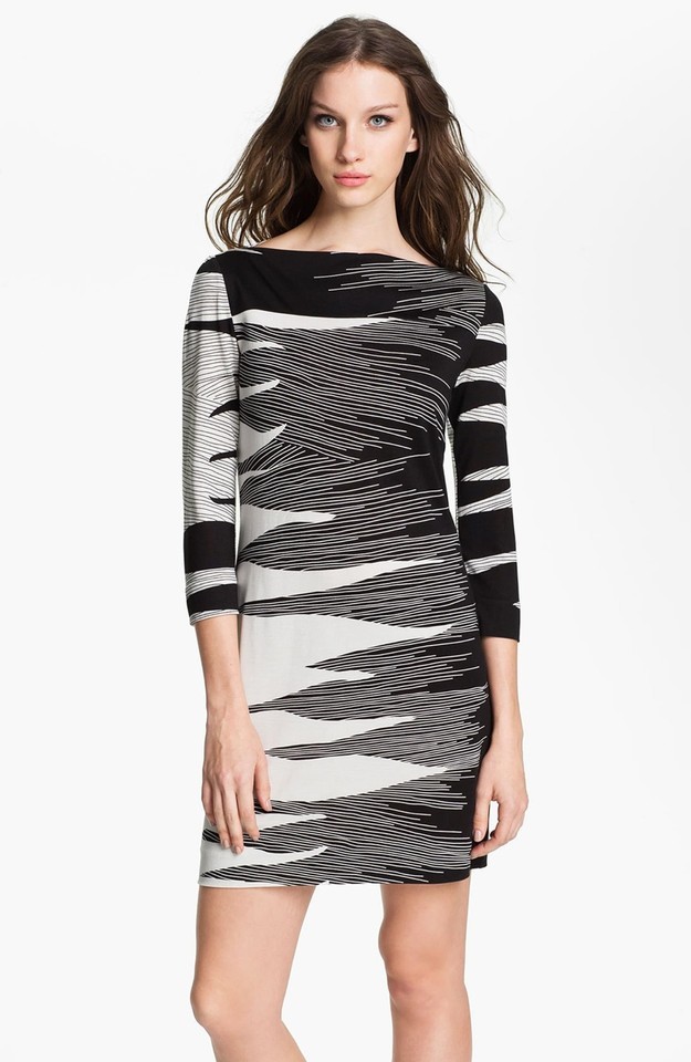 An edgy, striated print decorates a boatneck silk-jersey shift dress.