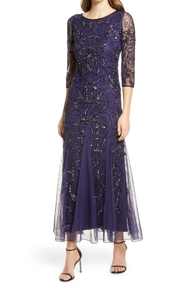 This curve-skimming evening gown makes an opulent choice for red-letter events with artfully swirled beading that shimmers in the light.