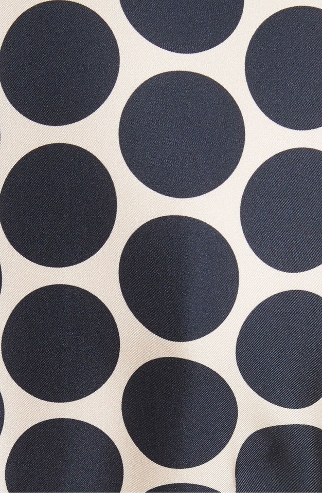 Bold polka dots in inverse colorways add trendy, graphic style to to this artfully gathered silk dress.