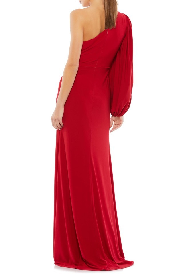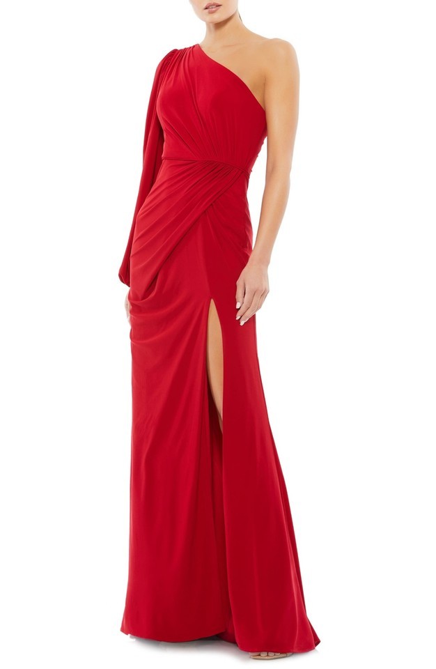 Mac Duggal 67879 One-Shoulder Long Sleeve Ruched Jersey Gown SZ 0 ($348) Red