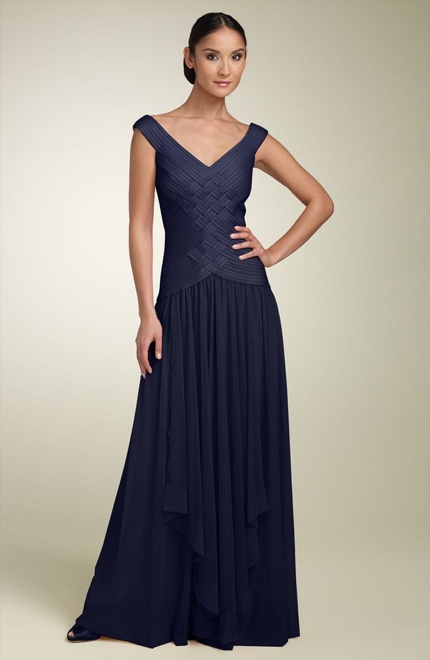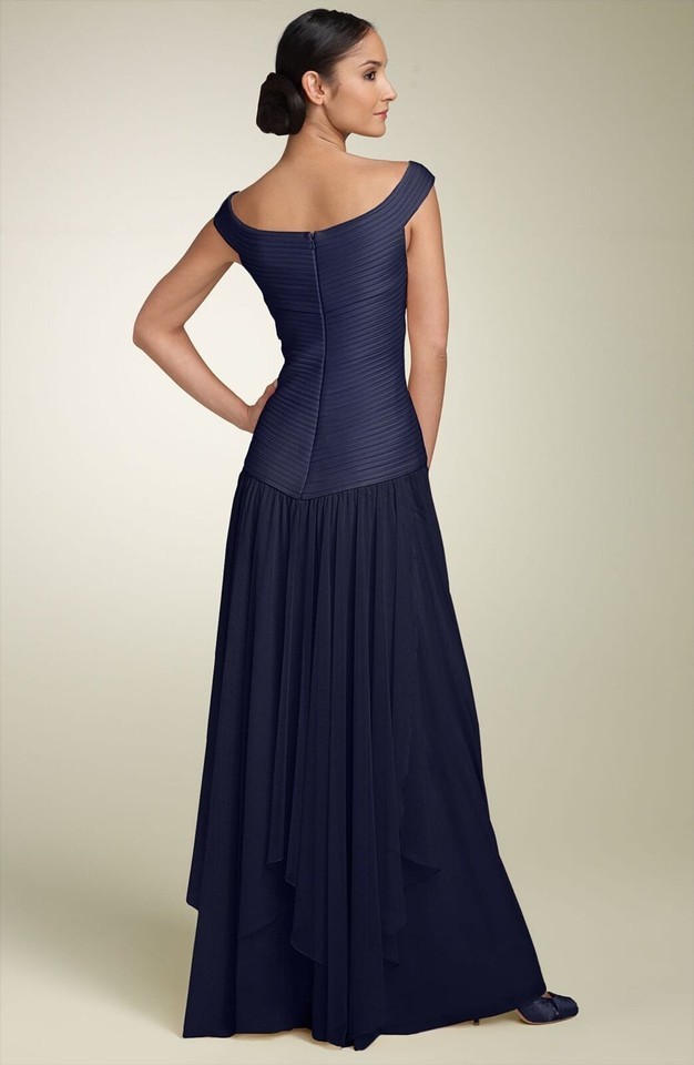 An elegantly shaped gown pairs a woven bodice with an off-shoulder neckline and a sweeping, floor-length skirt cut from layers of airy mesh.