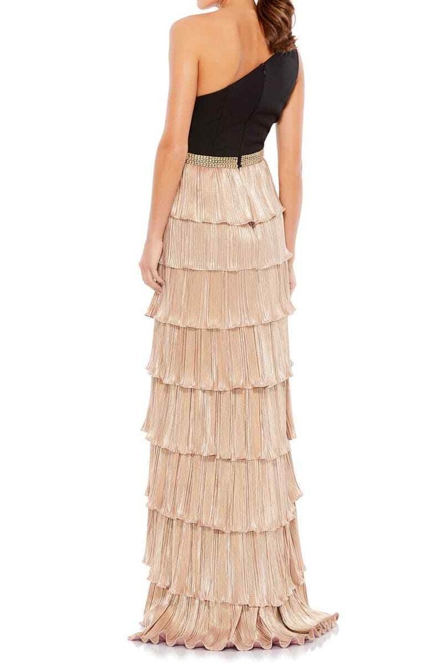 Ieena Mac Duggal 26541 One-Shoulder Ruffle Tiered Gown SZ 8 Black Gold