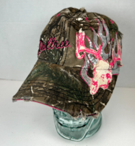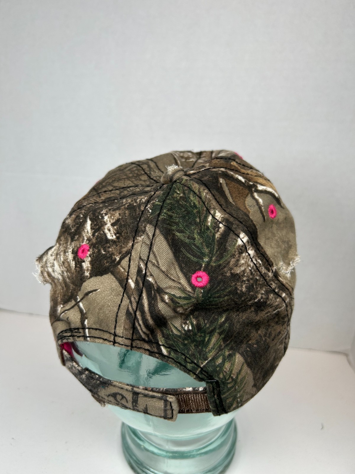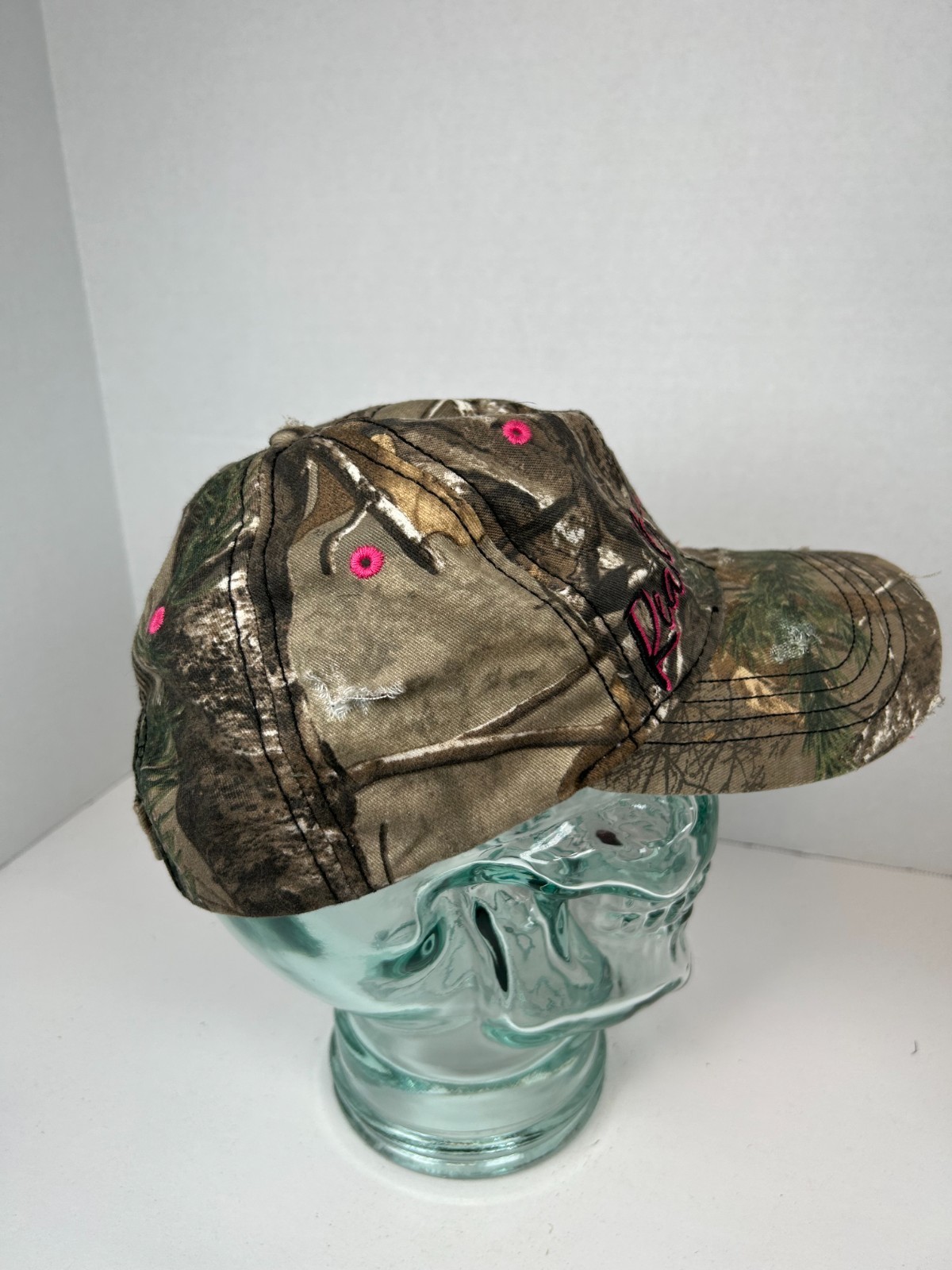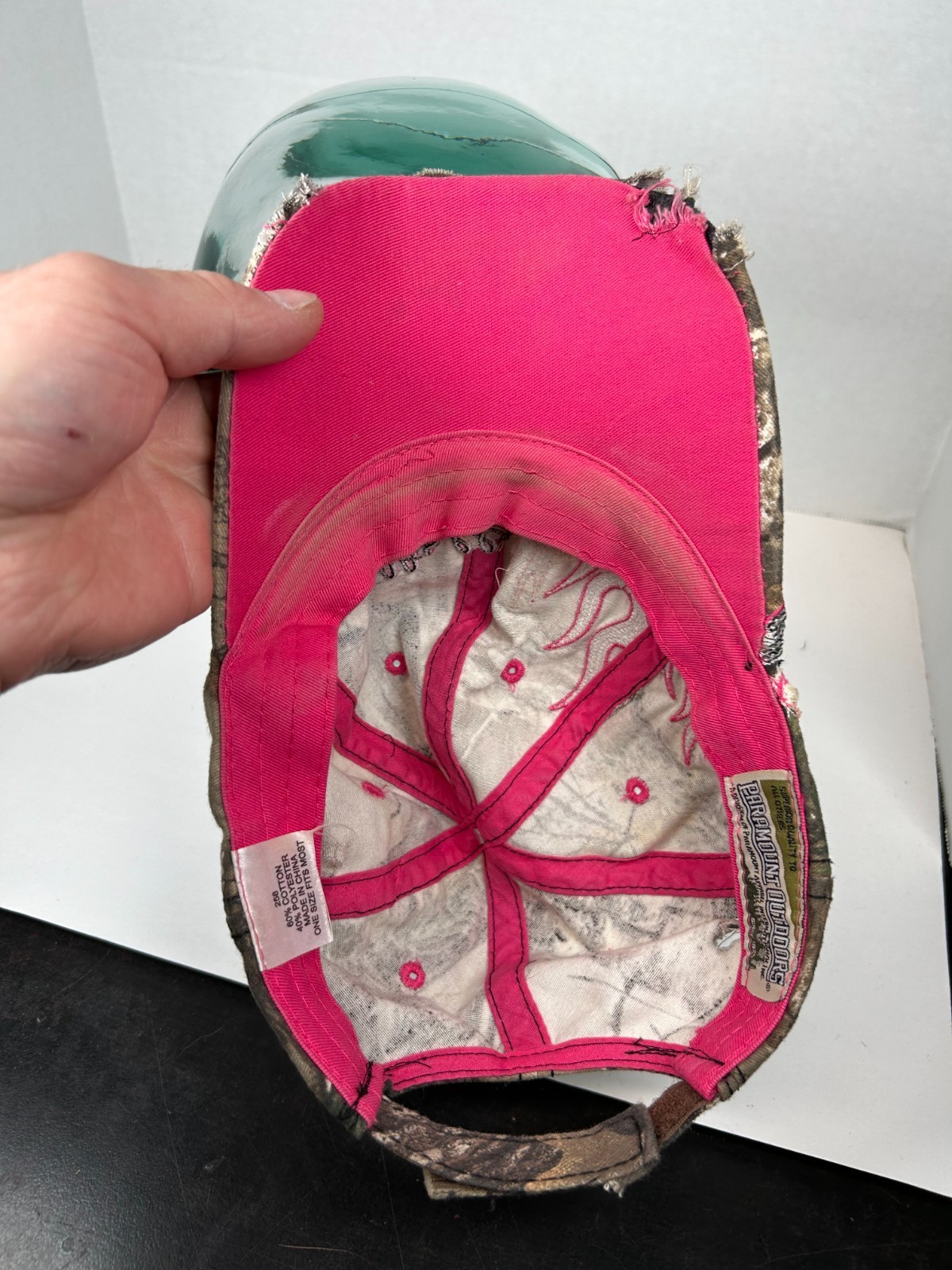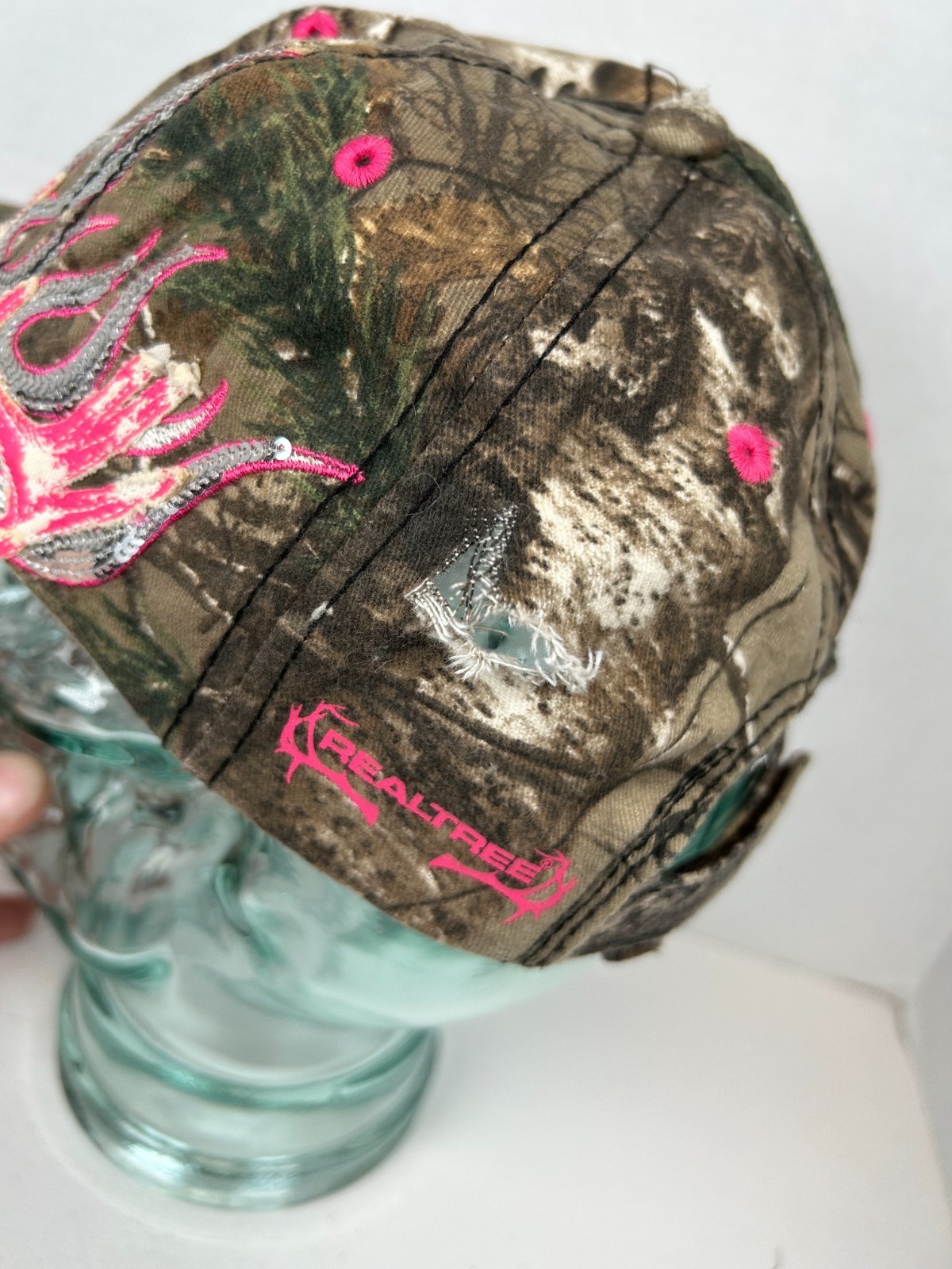 REALTREE Womens Distressed Hat Cap, Camo w/ Hot Pink Sequin Deer Skull Trophy