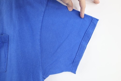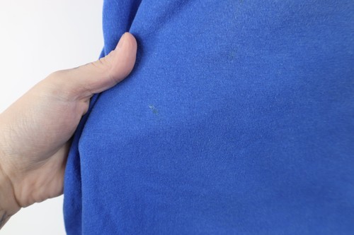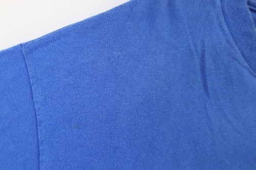 Bleach blemished/sun faded front, back. Pin hole front right shoulder. Stains front, back, collar. Collar, arms/armpits discolored. Color faded. Pilling. Loose threads right arm, back bottom. Made in USA