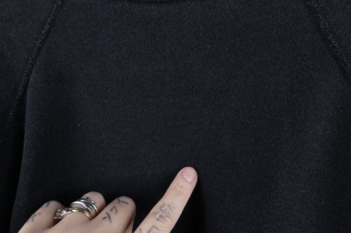 Dark spots/blemishes throughout. Collar, cuffs, bottom discolored. Color faded. Pilling. Seams distressed. Made in USA