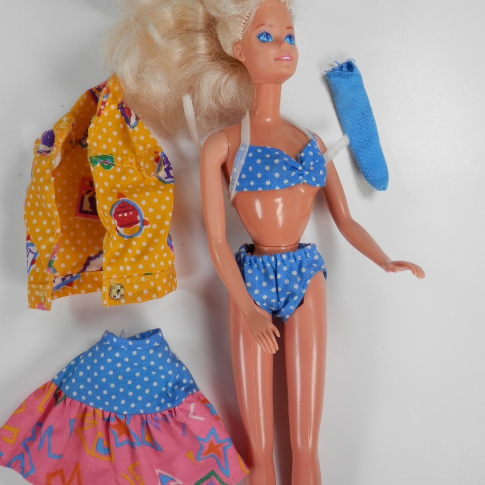 Barbie doll, vest, sneakers, skirt, camera, bikini, single sock, and sneakers