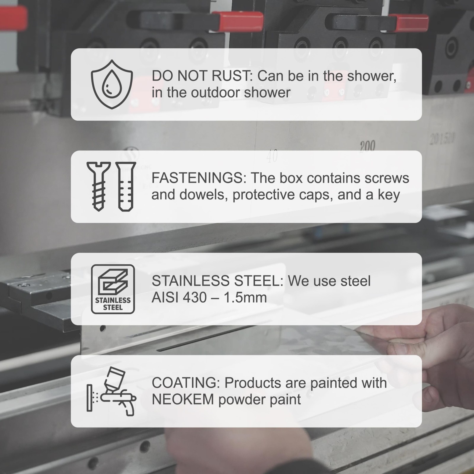 The product is painted with NEOKEM powder paint and baked at 200 degrees