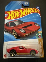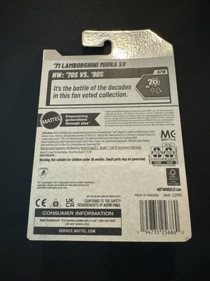 The product is a Hot Wheels 1971 Lamborghini Muira sv from the 70's vs '90's series. This diecast car is a 1:64 scale model of the iconic Lamborghini, featuring a red color and detailed craftsmanship. With the brand's reputation for quality and collectibility, this vintage car is sure to be a prized addition to any diecast vehicle collection. Ideal for car enthusiasts and collectors, this Lamborghini Muira sv offers a glimpse into the world of 1970's automotive design.