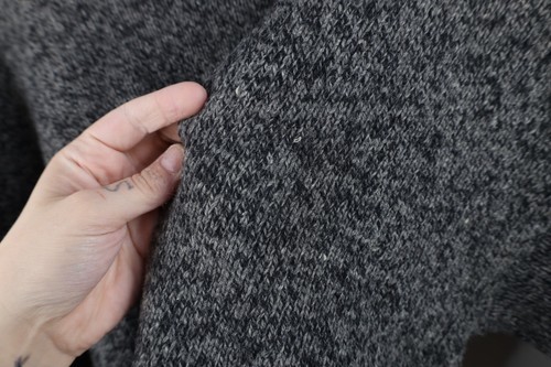 Blemish right sleeve. Light threads throughout. Loose threads back. Color faded. Pilling. Made in USA