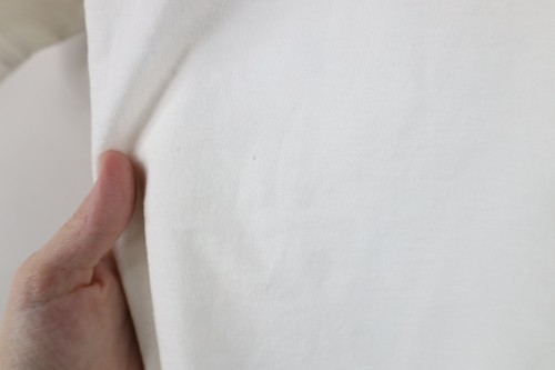 Blemish on back. Collar, arms discolored. Yellowed. Pilling. Made in USA