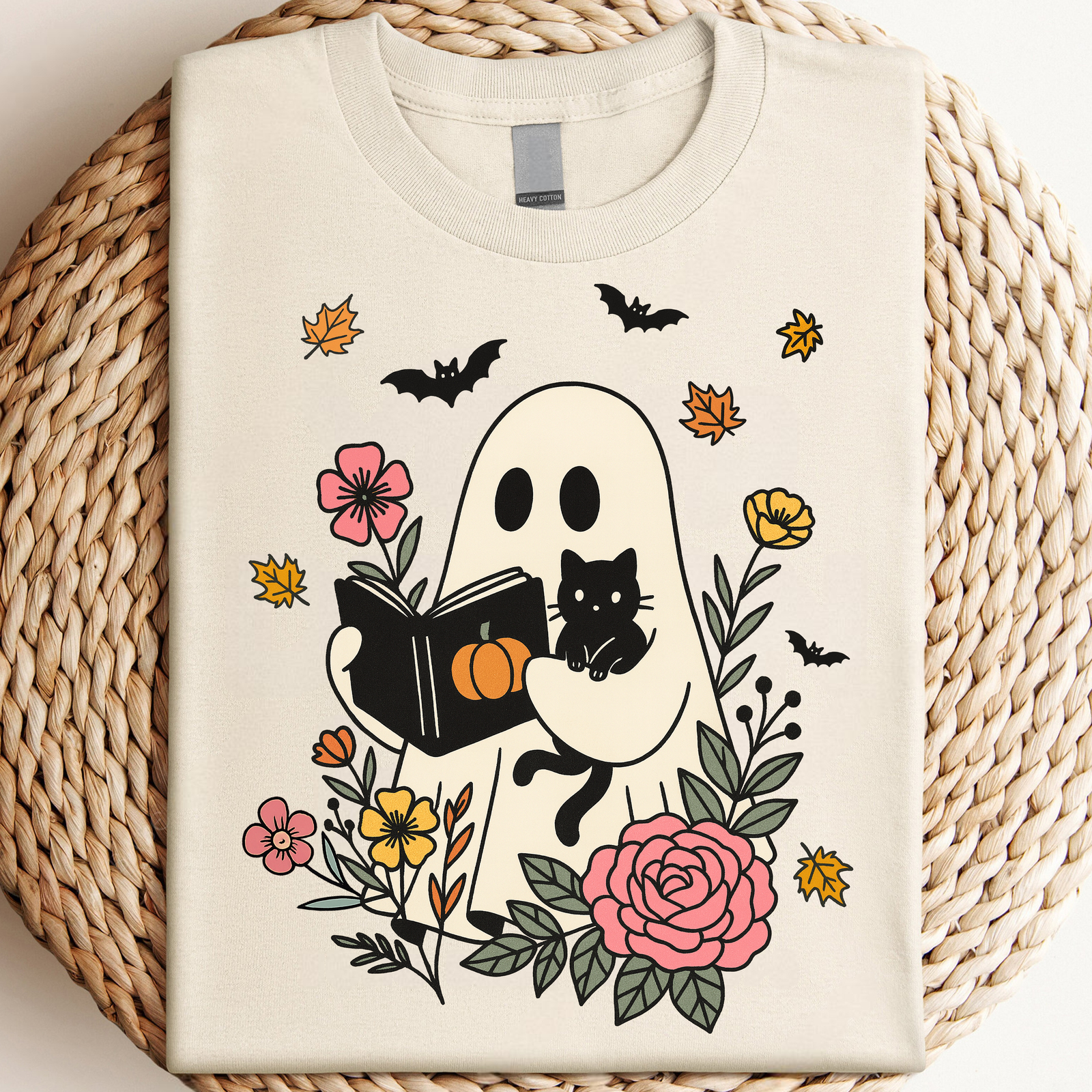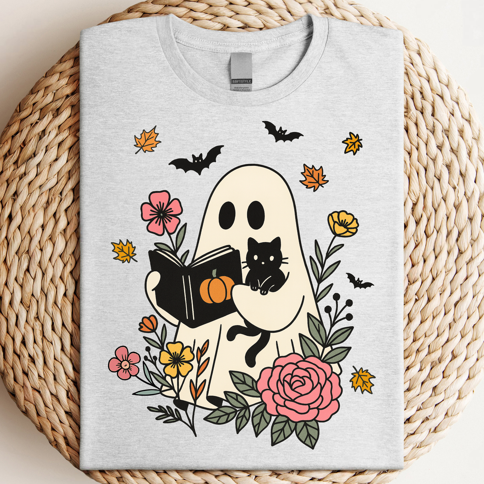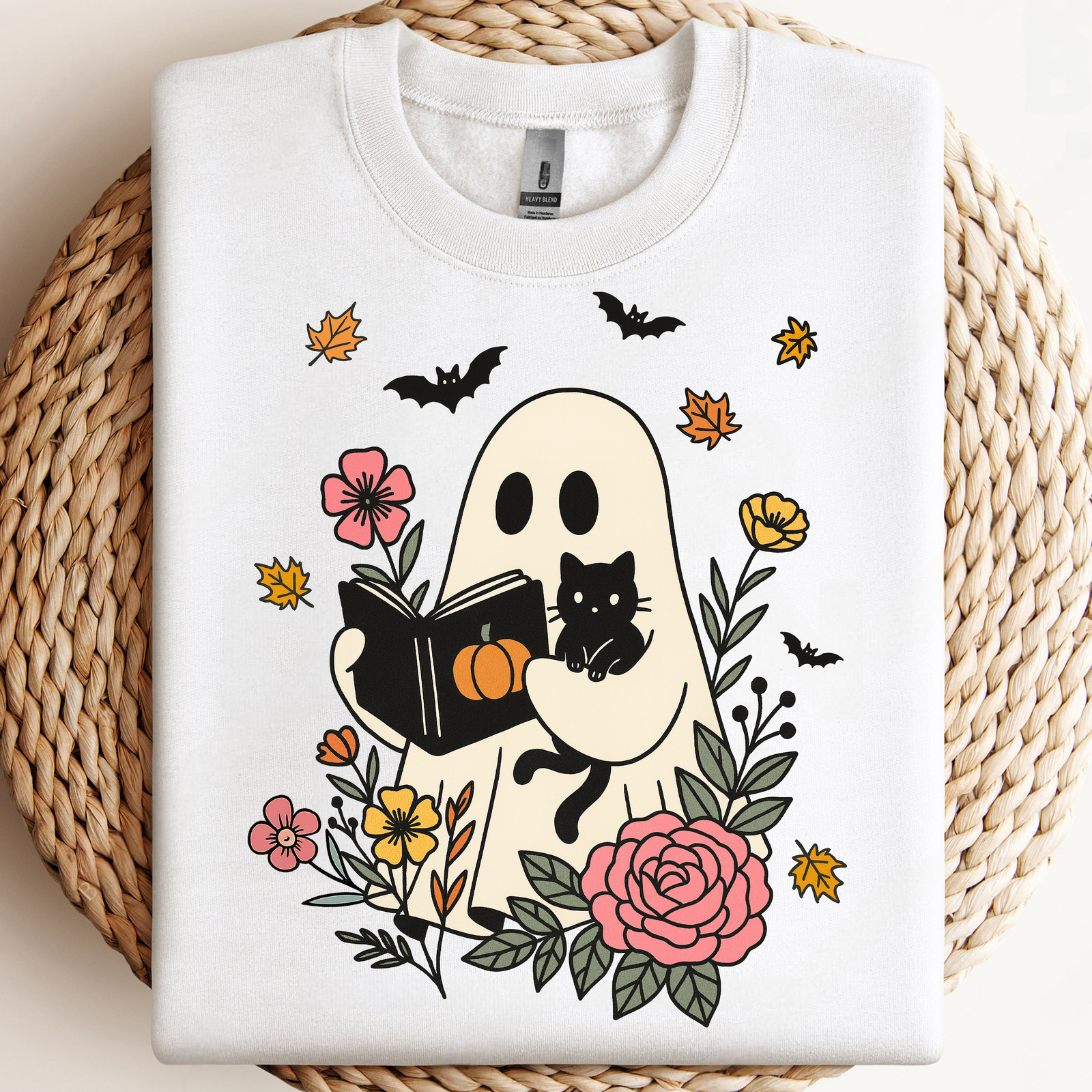 Ghost Black Cat and Book PNG, Spooky Reader PNG, Floral Ghost Halloween PNG, Trending Design